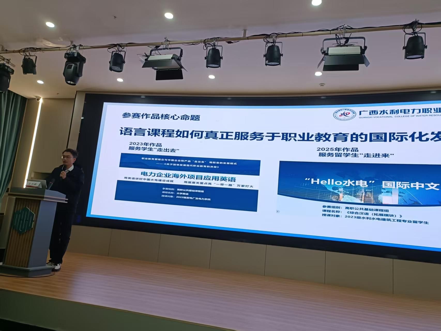 [本网讯]为深化“强国行”专项行动,推动党建与教学改革深度融合,提升语言类课程服务职业教育国际化的能力,通识教育学院党支部组织英语骨干教师于12月5日参加了由广西职业院校语文数学外语教学指导委员会主办的2025年广西高职院校英语示范巡讲活动。党员教师王力鹏以《融通·赋能·致远——语言课程服务职业教育国际化的探索与实践》为题作经验分享,展现了我校在党建引领下教育教学改革的扎实成效。