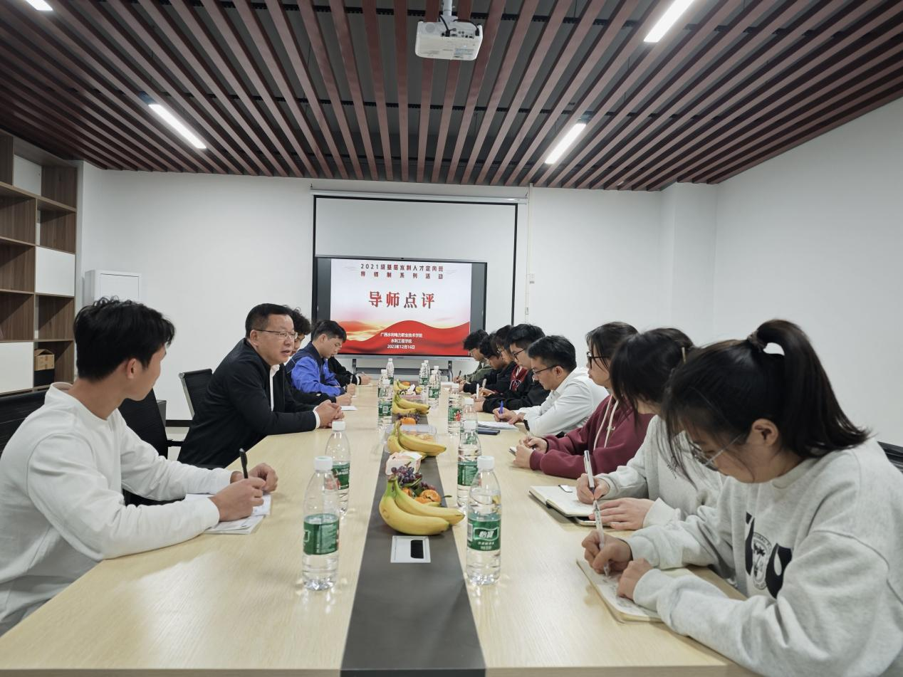 [本网讯]为全面贯彻国家教育方针,切实提高基层水利人才的综合能力,全力贯彻导师制培养制度,12月7日下午,李林校长以导师的身份组织2021级水利基层人才定向班第一小组在里建校区水工实训楼会议室召开跟岗实习心得交流分享会。水利工程智能管理教学团队负责人韦庆华陪同参会。