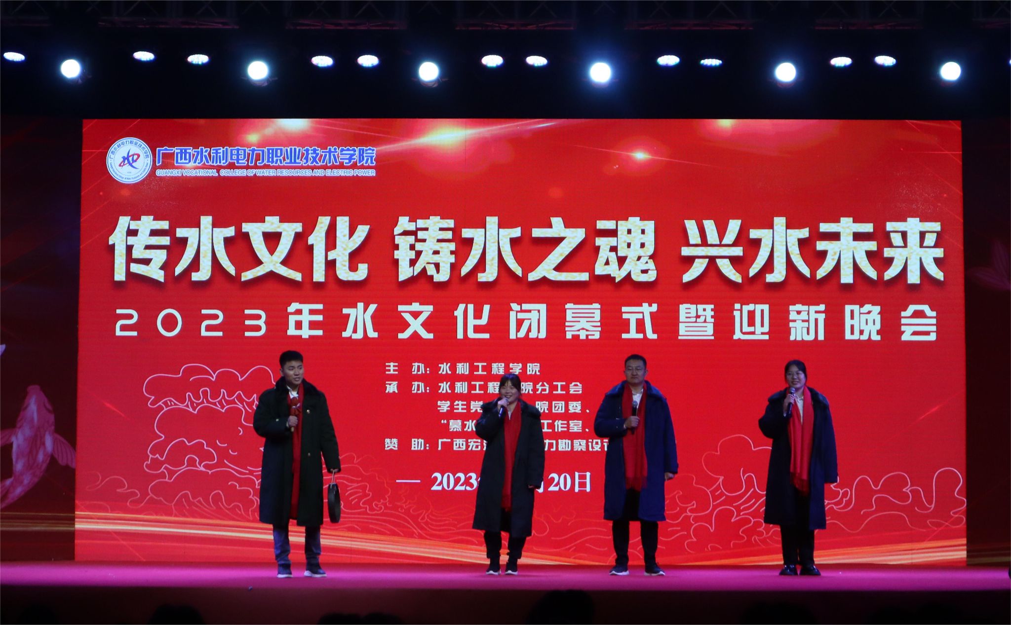 晚会的一大亮点是通过“水文化”系列活动回顾串联的方式,生动展现了2023年校园水文化的丰富内涵。主持人围绕水知识开展现场有奖竞答,现场气氛不断高涨。李林校长、周涛副校长、虞松宾总经理分别为2023年“水文化”系列活动中获奖的153名代表颁奖,余金凤院长为广西宏源水利电力勘察设计有限公司颁发了“情系职业教育优秀企业”锦旗。晚会在各位老师的多种语言祝福中推向高潮,晚会圆满结束。