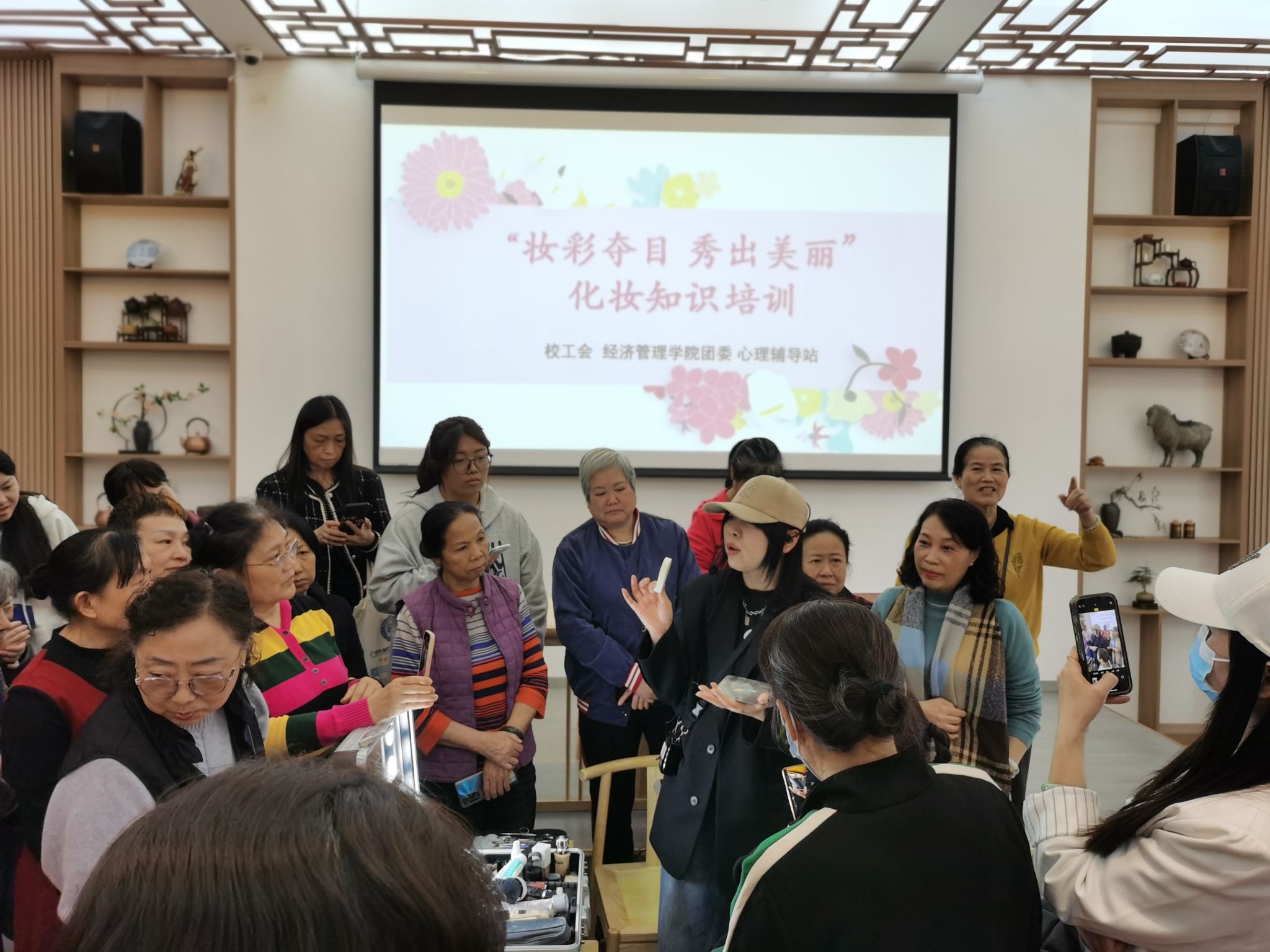 3月7日,在长堽校区经管实训楼茶艺实训室,校工会与经济管理学院联合举办“跟党奋进新征程 巾帼建功新时代”2024年“三八”妇女节主题活动暨“妆彩夺目 秀出美丽”化妆知识培训,校工会聘请了从事化妆行业二十多年,有着丰富经验的化妆师许冬云老师来授课,讲课内容主要有日常妆容和舞台妆容。许老师一边给模特化妆,一边进行肌肤护理、化妆品知识分享和化妆手法技巧讲解,退休女教职工、师生们围坐在一起,认真仔细地看着许老师的操作,有的录像、拍照记录,有的做学习笔记,大家对美丽的追求在同一频道。