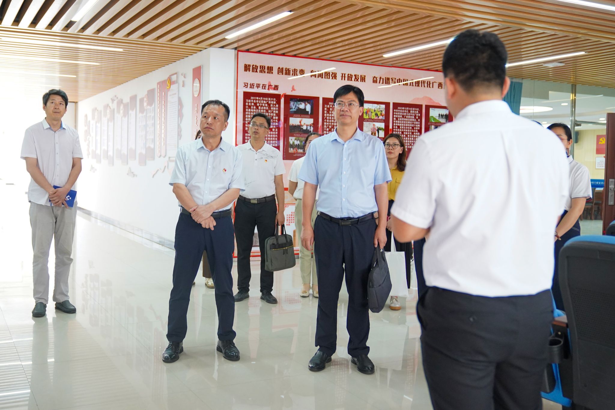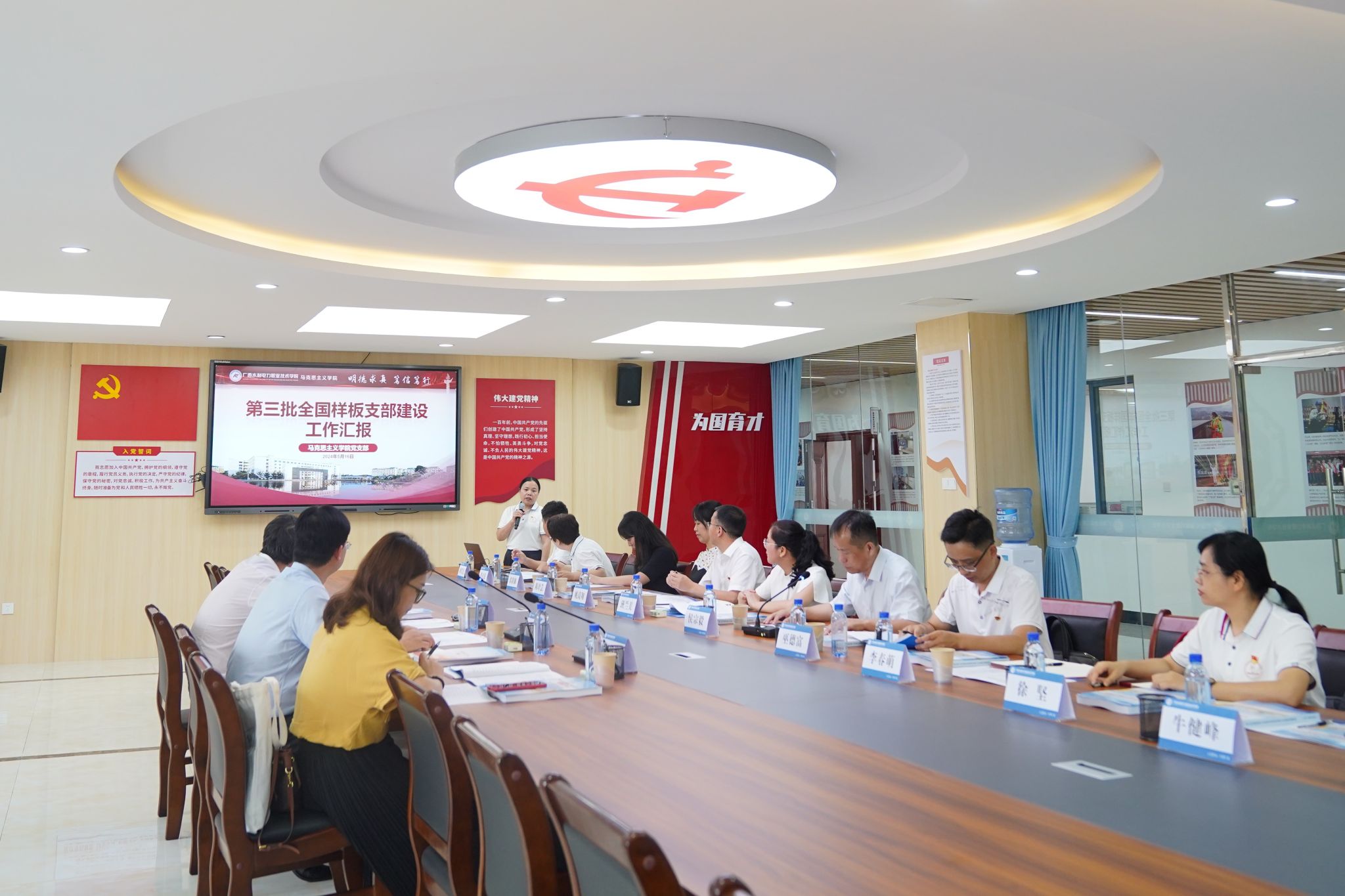 [本网讯]5月16日下午,由广西大学动物科学技术学院党委书记韦小强、广西建设职业技术学院土木工程学院党总支书记孔祥刚、南宁职业技术学院党委组织部(统战部、人事处)组织科科长谢曼妮组成的验收专家组到学校里建校区开展第三批全国党建工作样板支部验收工作。学校党委副书记侯宗毅、党委组织部(人事处)副部长(副处长)巫德富、水利工程学院党总支书记班兰美、马克思主义学院党支部书记李春萌以及支部委员、党员教师代表等参加验收工作。
