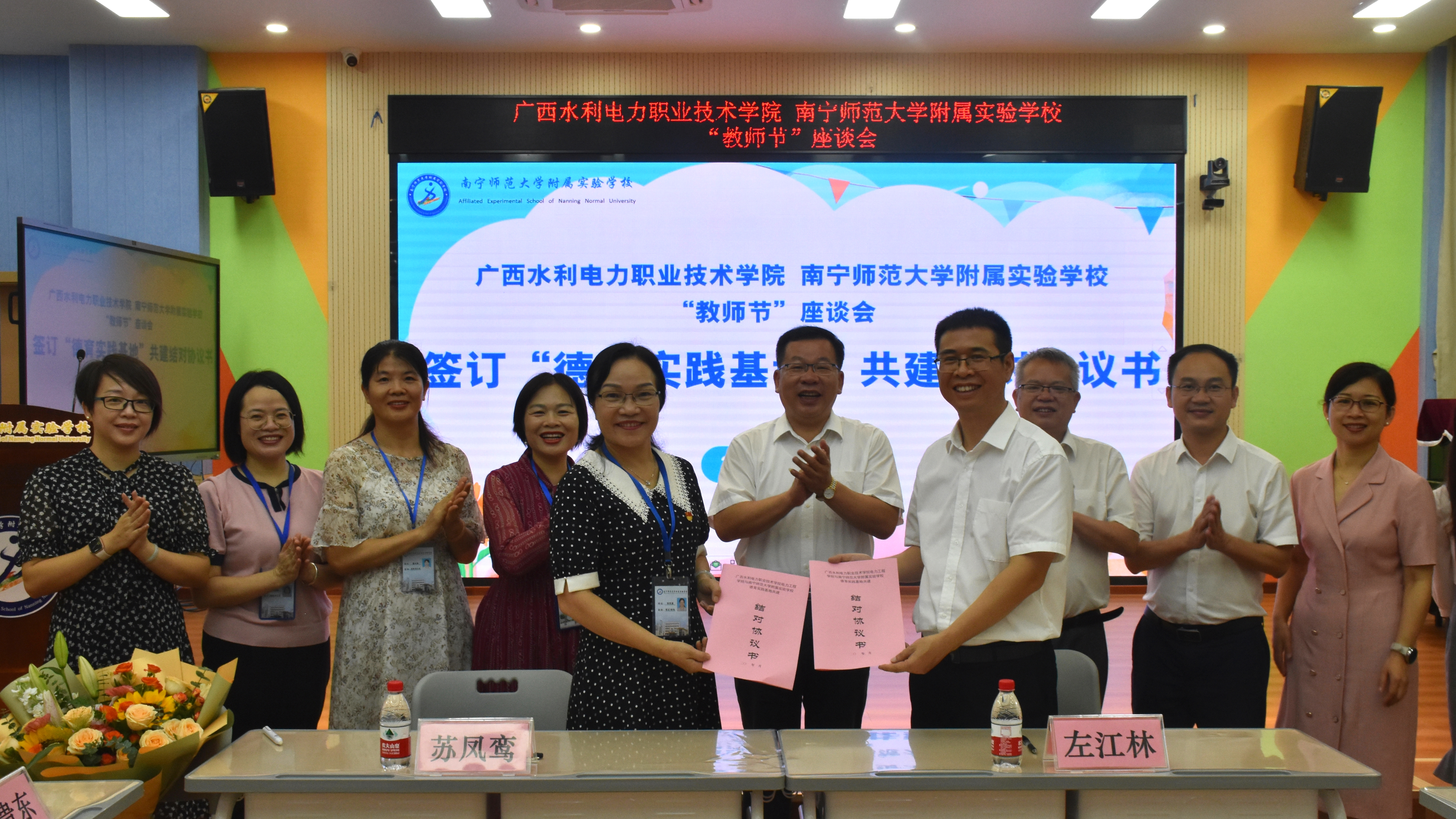 在本次活动中,学校电力工程学院还与南师大附校共同签订了《德育教育实践基地共建协议书》,双方协议商定使用广西水利电力职业技术学院电力工程学院“全国党建工作样板支部”、工匠文化长廊、大型电力实训基地等德育资源为南宁师范大学附属实验学校提供德育实践活动场所和师资力量,引导小学生传承红色精神、弘扬工匠文化、致敬光辉榜样、促进全面发展。