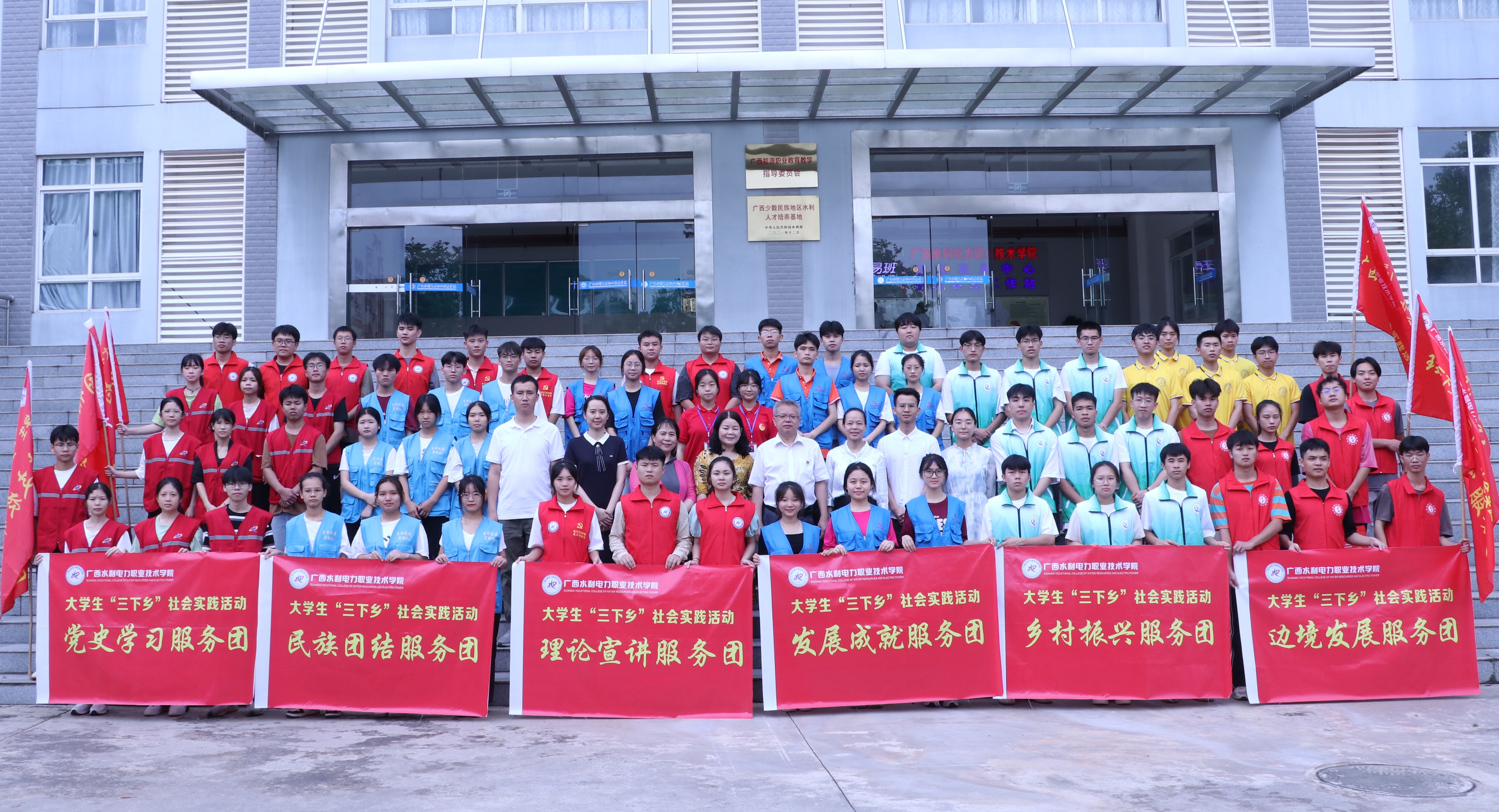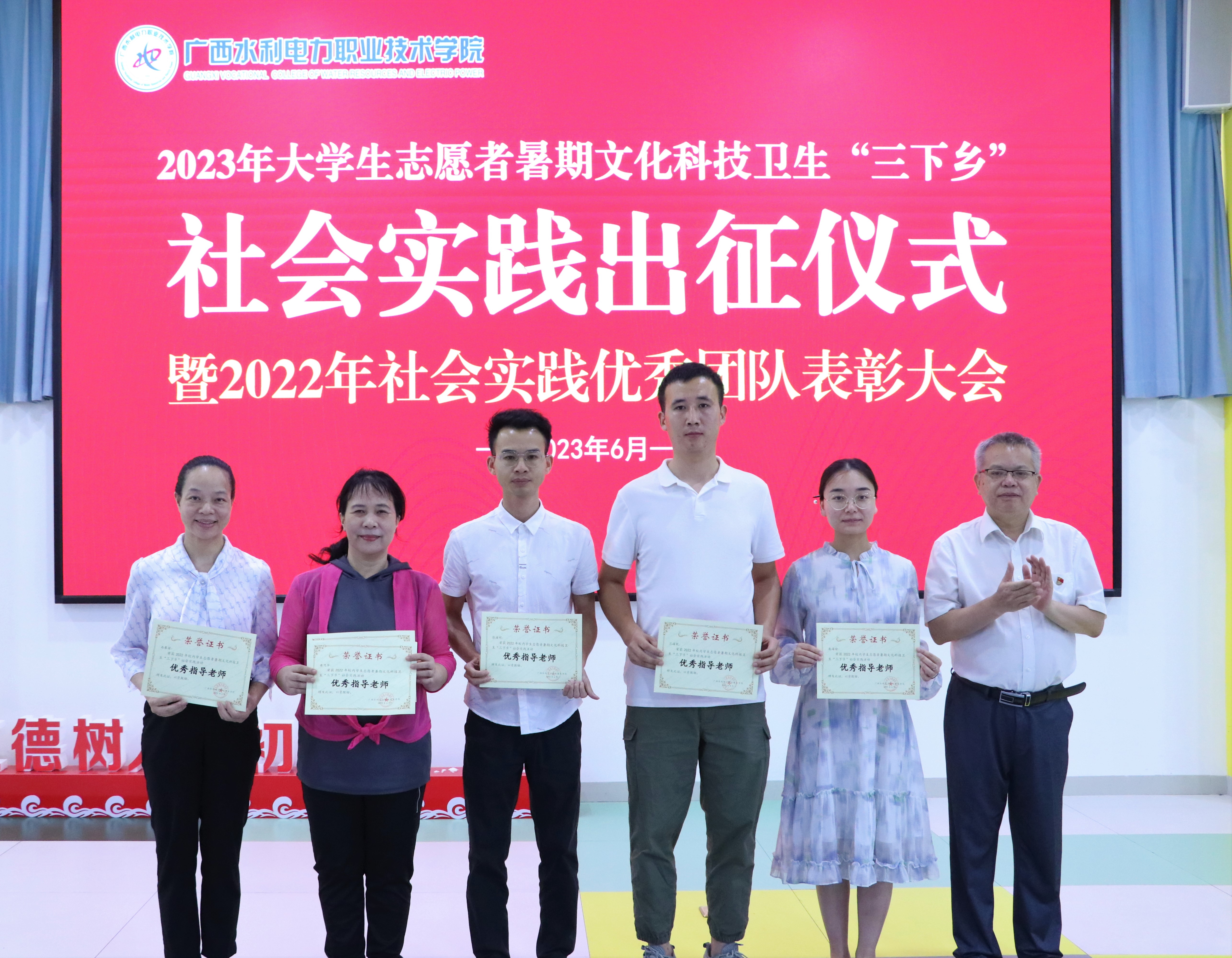 仪式中,学校团委书记石春丽宣读表彰了2022年广西“三下乡”社会实践重点团队名单,要求各学院巩固社会实践活动成果,发挥先进典型示范引领作用,激励学生踊跃参与社会实践。
