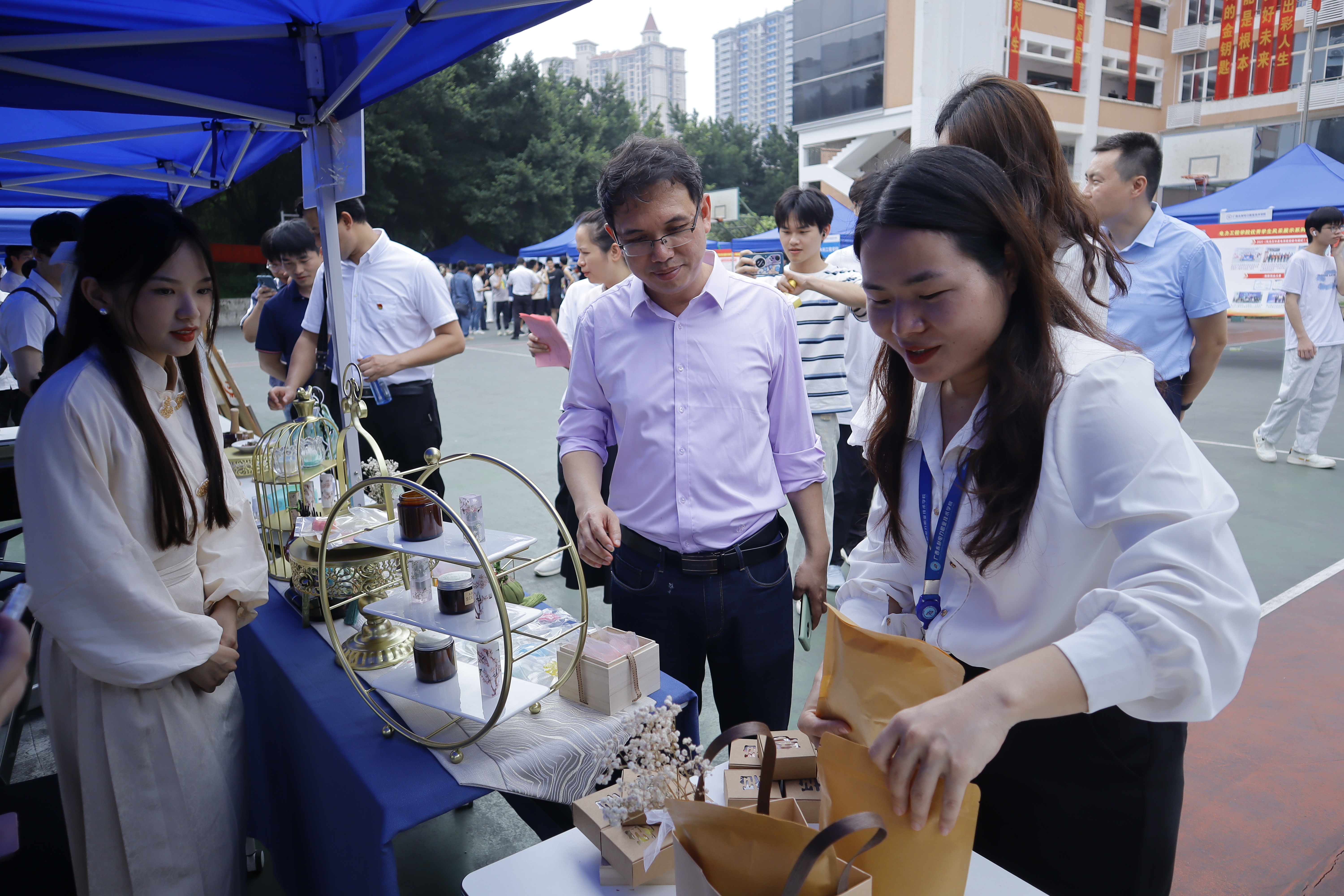 仪式结束后,校领导一行移步篮球场,观摩各学院学子精湛的专业技能展示。