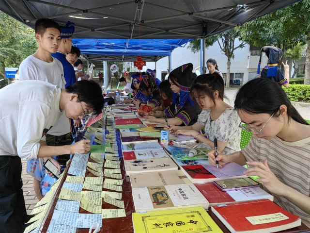 活动现场,鼓乐声阵阵激昂,壮族舞狮时而翻滚跳跃,时而摇头摆尾、憨态可掬,校园里洋溢着热烈喜庆节日气息。“远方的朋友欢迎到壮乡来,家中只有粗茶淡饭请你莫见怪……”一曲壮乡韵味十足的《欢迎您到壮乡来》拉开了主题活动的序幕,热情好客的八桂儿女身着节日盛装,用歌声传递最真挚的喜悦和感谢。接着,在身着民族服饰的青年学生引领下,师生手牵手、心连心,踏着欢快的音乐节奏,共跳竹竿舞。另一边,背篓绣球、三人板鞋、大象拔河等民族传统体育竞赛激烈开展,呐喊声、加油声此起彼伏。活动现场还安排了五色糯米饭拼图、跳竹竿舞、抛绣球、画彩蛋等民俗活动,师生们身着民族服饰一起沉浸式感受壮乡文化,增进民族文化认同,自觉维护、促进民族团结。