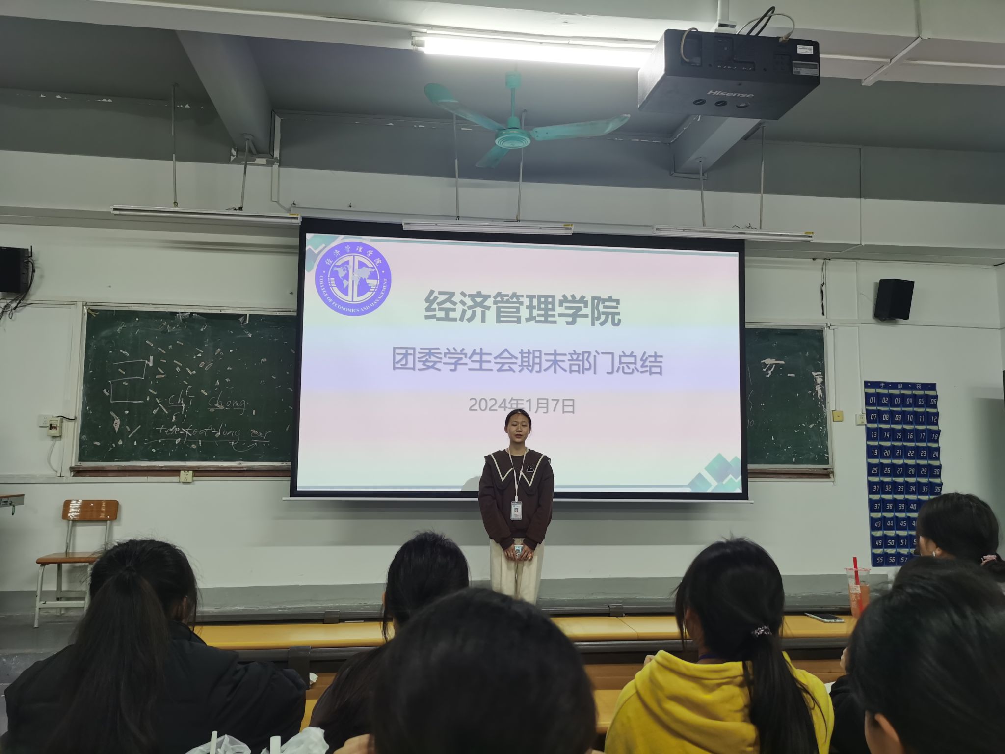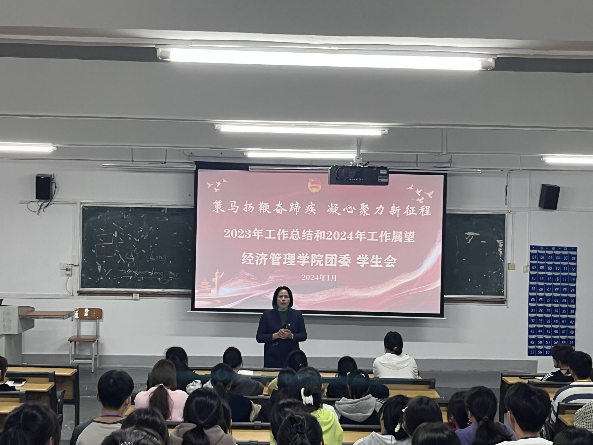 [本网讯]2024年1月7日,经济管理学院团委、学生会在长堽校区1教2-6阶梯教室召开2023年工作总结大会暨书记微团课,学院团委书记冯文、全体22级学生干部、23级学生实习干事共计120人参加会议,学生会秘书部李金玲同学主持会议。