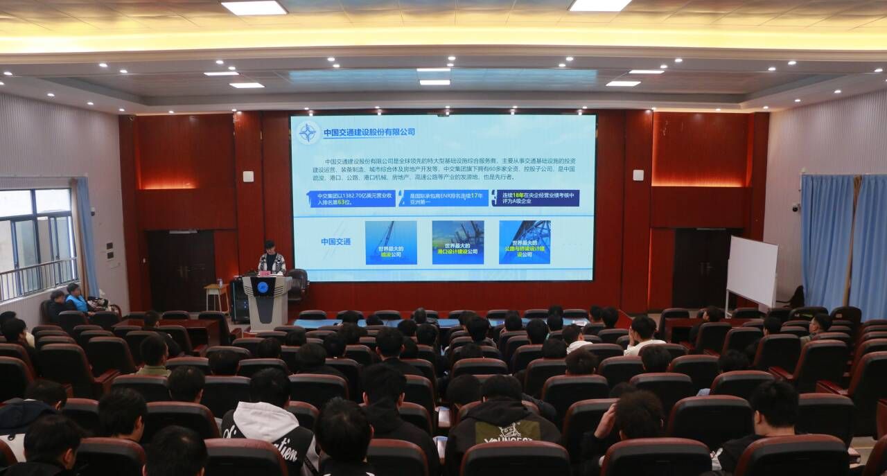 [本网讯]为积极推进2021级毕业生实习、就业工作,贯彻落实“访企拓岗促就业”专项行动,进一步加强校企合作,1月11日,水利工程学院邀请中交第一航务工程局有限公司到里建校区教学楼二号报告厅召开专场招聘会。招生就业处黄曦慧副处长、水利工程学院党总支书记班兰美、土木建筑工程学院党总支书记梁中超、教师代表及21级在校生参加宣讲招聘会。