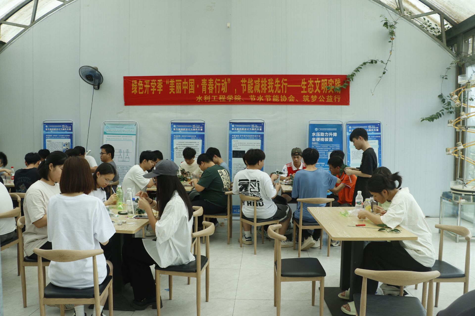 本次生态文明实践主题活动包括绿色低碳作品展示、现场环保知识游戏、塑料再生花制作体验等系列活动。节水节能行动协会的志愿者现场分享了“绿色转型,节能攻坚”的重要性和实施措施,引导同学们在日常生活中减少浪费、注重环保。同学们热情高涨地参与活动。水利学院零生万绿研学社还准备了工具和材料,指导同学们将自己收集的废旧饮料瓶进行剪裁定型、热熔粘合。看到在手中逐渐绽放的一朵朵精美的塑料循环再生花,同学们纷纷表示这是一次有意义的体验。