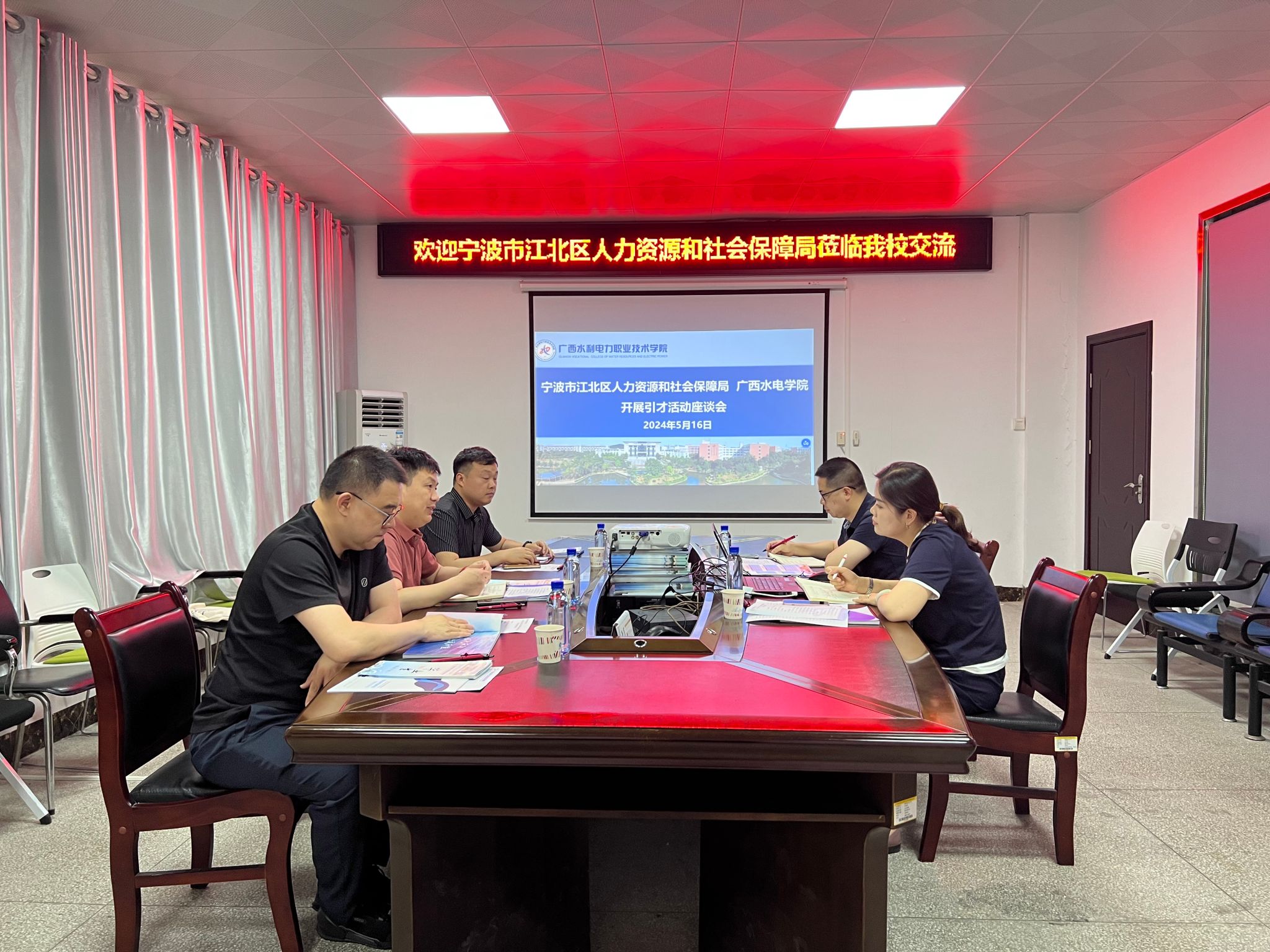 [本网讯]5月16日下午,宁波市江北区人力资源和社会保障局江北区产教融合基地(江北区人力资源市场)主任杨中伦、江北区产教融合基地校企合作负责人宁宾宾与浙江舜宇光学有限公司管理部部长周密一行三人莅临我校就政校企人才合作展开座谈会。学校党委学生工作部(学生工作处)处长(部长)李晓红、招生与就业处副处长黄曦慧、机电工程学院副院长陈韶光参加活动。