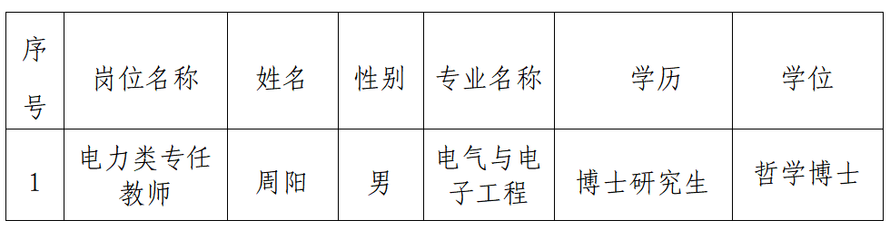 根据《广西壮族自治区事业单位公开招聘人员实施办法(修订)》(桂人社规〔2025〕11号)、《广西水利电力职业技术学院2026年公开招聘高层次人才(博士)公告》,经报名、资格审查、考核、考察与体检,并经学校领导班子集体研究等程序,拟聘周阳同志为我校工作人员。现予以公示,公示期为5个工作日(2026年4月24日至4月30日)。