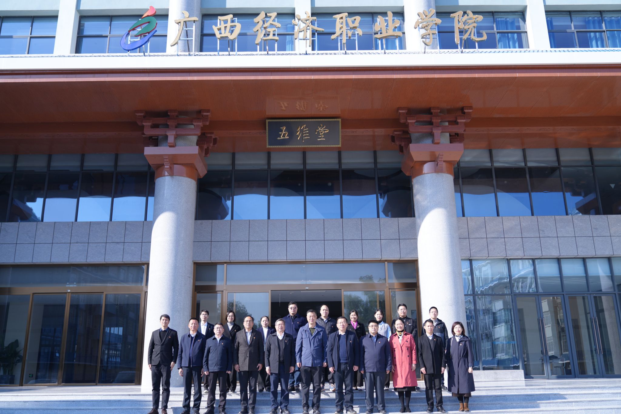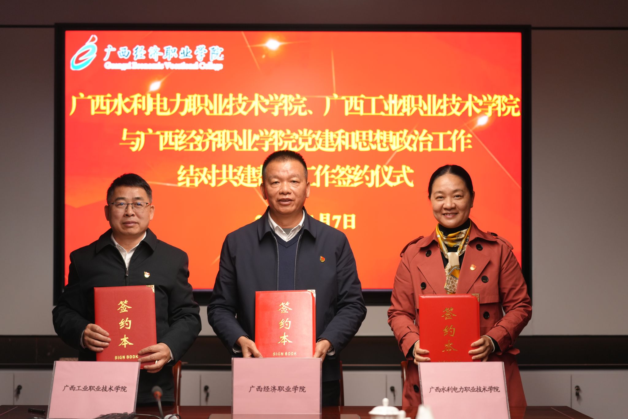 我校党委副书记莫海燕与广西工业职业技术学院党委副书记李爱民、广西经济职业学院党委副书记、党委组织部部长、常务副校长陈周俭代表三校共同签署结对共建协议。我校马克思主义学院与广西经济职业学院马克思主义学院开展结对共建揭牌仪式。随后,与会人员参观了广西经济职业学院特色场馆、进行听课与专题座谈。