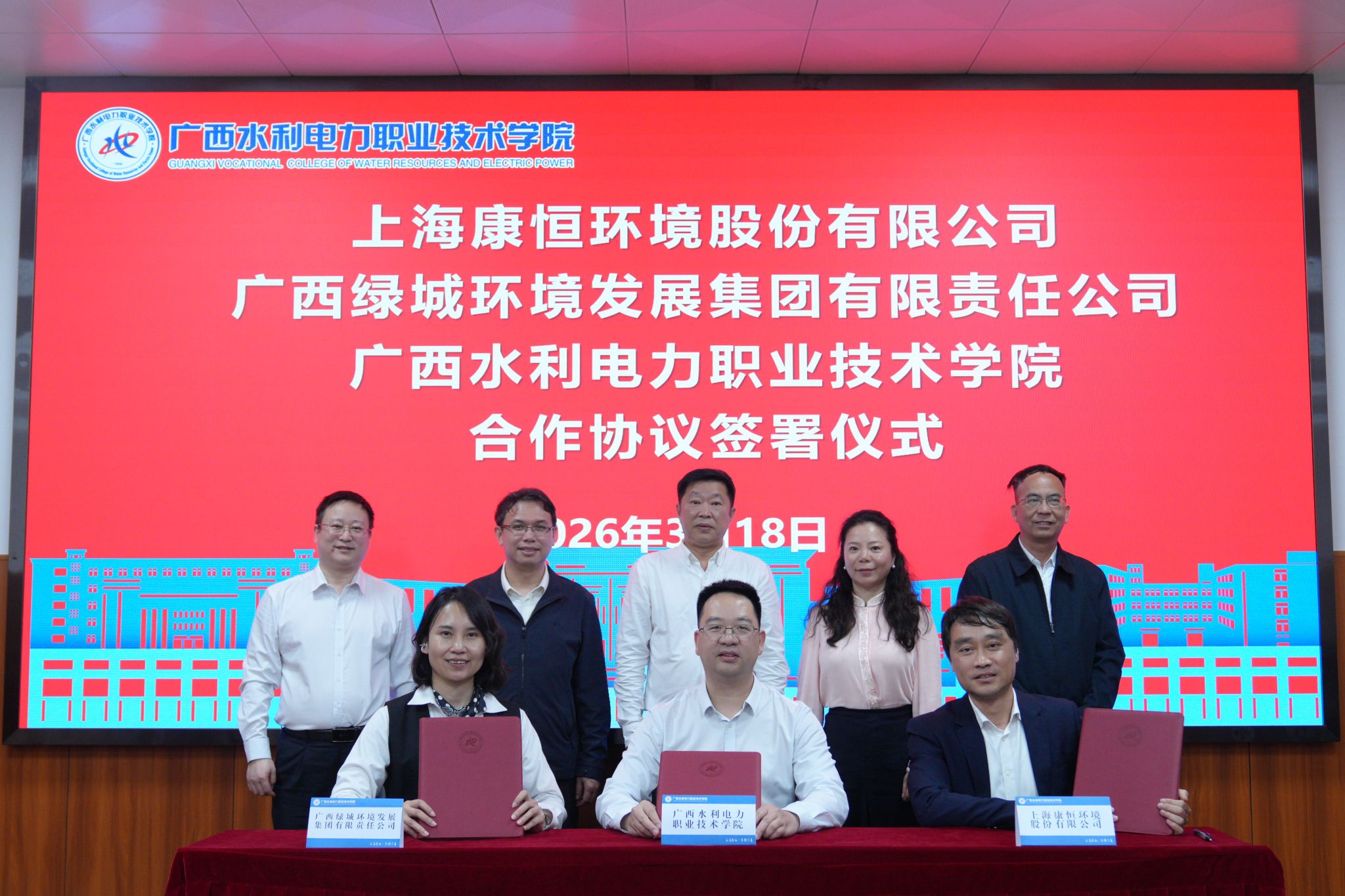 [本网讯]3月18日下午,学校与上海康恒环境股份有限公司、广西绿城环境发展集团有限责任公司三方战略合作协议签约仪式在里建校区图书馆三楼会议室举行。学校副校长周涛、上海康恒环境股份有限公司研究院院长白力、广西绿城环境发展集团有限责任公司人力资源部负责人武秀梅分别代表三方进行签约。自治区水利厅副厅长、一级巡视员李建文,学校校长刘存香,上海康恒环境股份有限公司轮值CEO李海燕,广西绿城环境发展集团有限责任公司董事长魏金,梧州市计量测试所所长邓若栋共同见证签约。期间,各方还进行了座谈交流,并就深化校企合作、服务区域高质量发展达成共识。