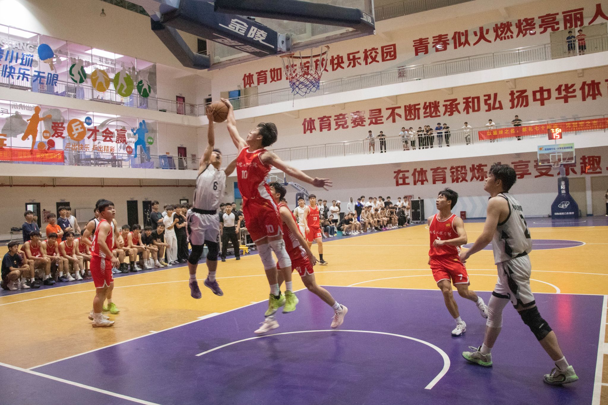 本届联赛以“迎‘篮’而上七十载,踔厉奋发向未来”为主题,将体育竞技与校庆文化深度融合。决赛现场气氛热烈,参赛队伍攻防转换流畅,精准远投、犀利突破、严密防守轮番上演,精彩瞬间不断点燃全场热情。观众加油助威声此起彼伏,体育馆内洋溢着青春热血的昂扬氛围。