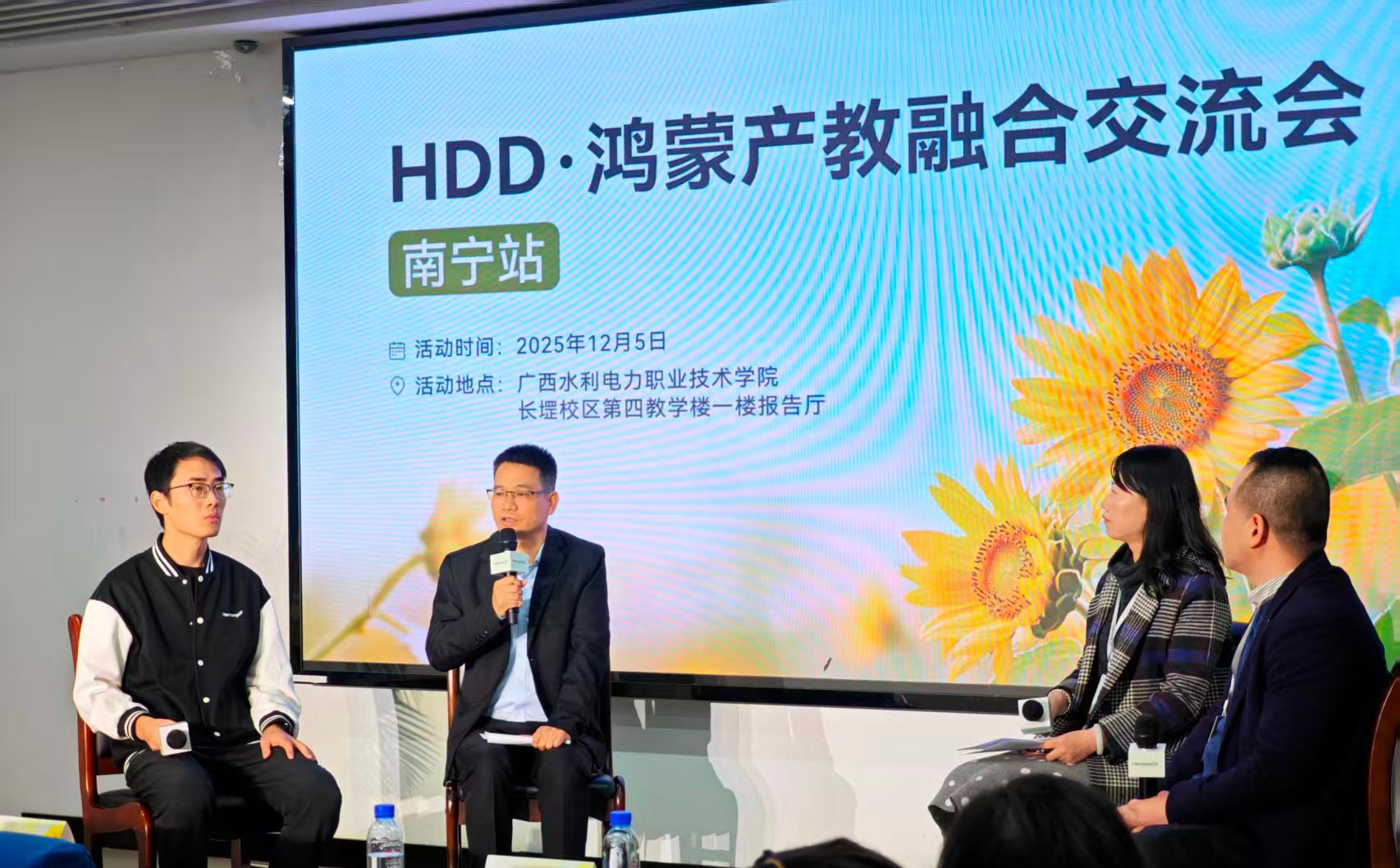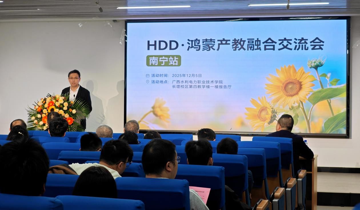 刘存香在HDD・鸿蒙产教融合论坛上作交流发言,他从产教融合基础建设、校企协同育人、双师队伍培育、人才培养质量四个方面介绍了学校服务数字产业发展的实践成效。他指出,学校依托水利电力特色优势,组建“双师型”教师队伍,联合企业开展合作培养工作。未来,学校将聚焦鸿蒙生态与广西“面向东盟的人工智能国际合作高地”建设需求,深化政企校协同,推行“岗课赛证一体化”培养模式,为区域数字经济与水利电力行业培育更多高素质技术技能人才。