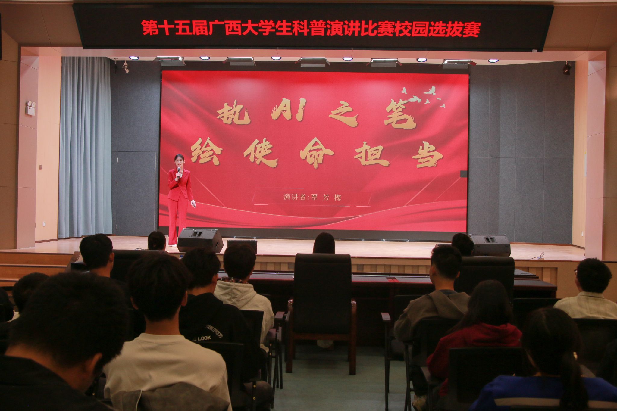 [本网讯]科技照亮前路,创新引领未来。12月9日下午,学校团委在里建校区大学生活动中心多功能厅成功举办第十五届广西大学生科普演讲比赛校园选拔赛。本次比赛以“AI赋能未来:探索·创新·责任”为主题,旨在提升青年学子的科学素养、创新思维与社会责任感。来自各学院的12名参赛选手同台竞技,用青春的视角阐释人工智能如何重塑世界,展现当代大学生的科技梦想与担当。