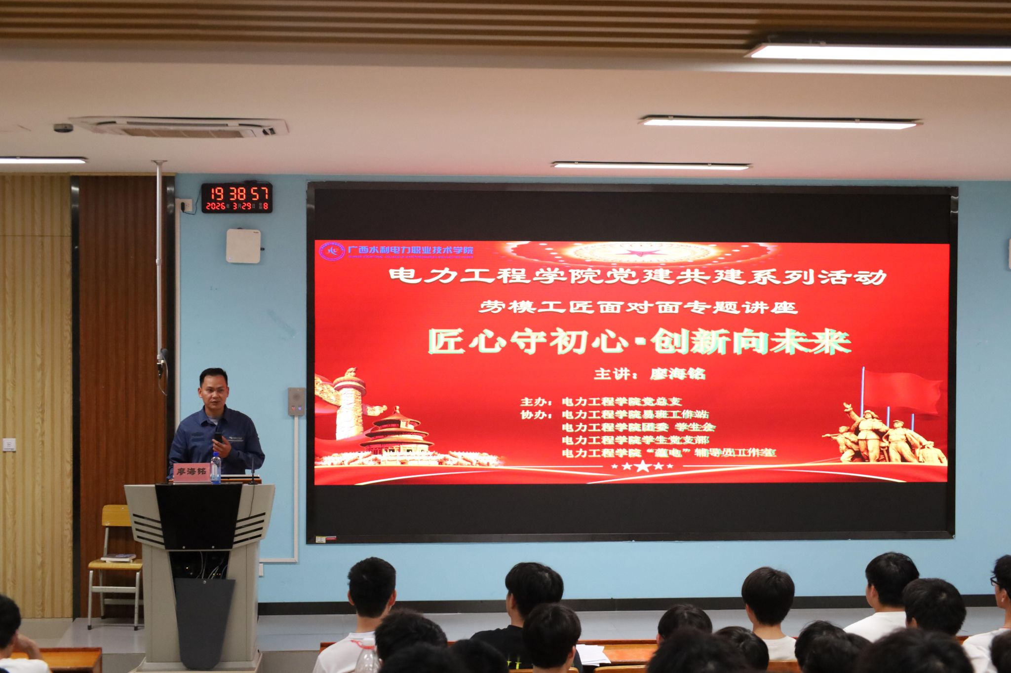 [本网讯]为大力弘扬劳模精神、工匠精神,引导青年学子树立正确的职业理想,3月29日晚,电力工程学院在里建校区教学楼成功开展党建共建系列活动——“匠承初心,电亮未来”劳模工匠面对面专题活动。本次讲座特邀李炎、何位经、李宝锋、廖海铭四位先进典型担任主讲嘉宾,他们曾获“全国五一劳动奖章”“全国技术能手”“广西工匠”“广西劳动模范”“南方电网劳模”等多项荣誉。电力工程学院党总支书记罗宇强出席本次活动,活动由电力工程学院专职组织员赵丹、团委负责人梁克冬、团委副书记徐鑫阳、“蕴电”辅导员工作室主持人丁丽丽主持,2024级、2025级学生到场聆听。