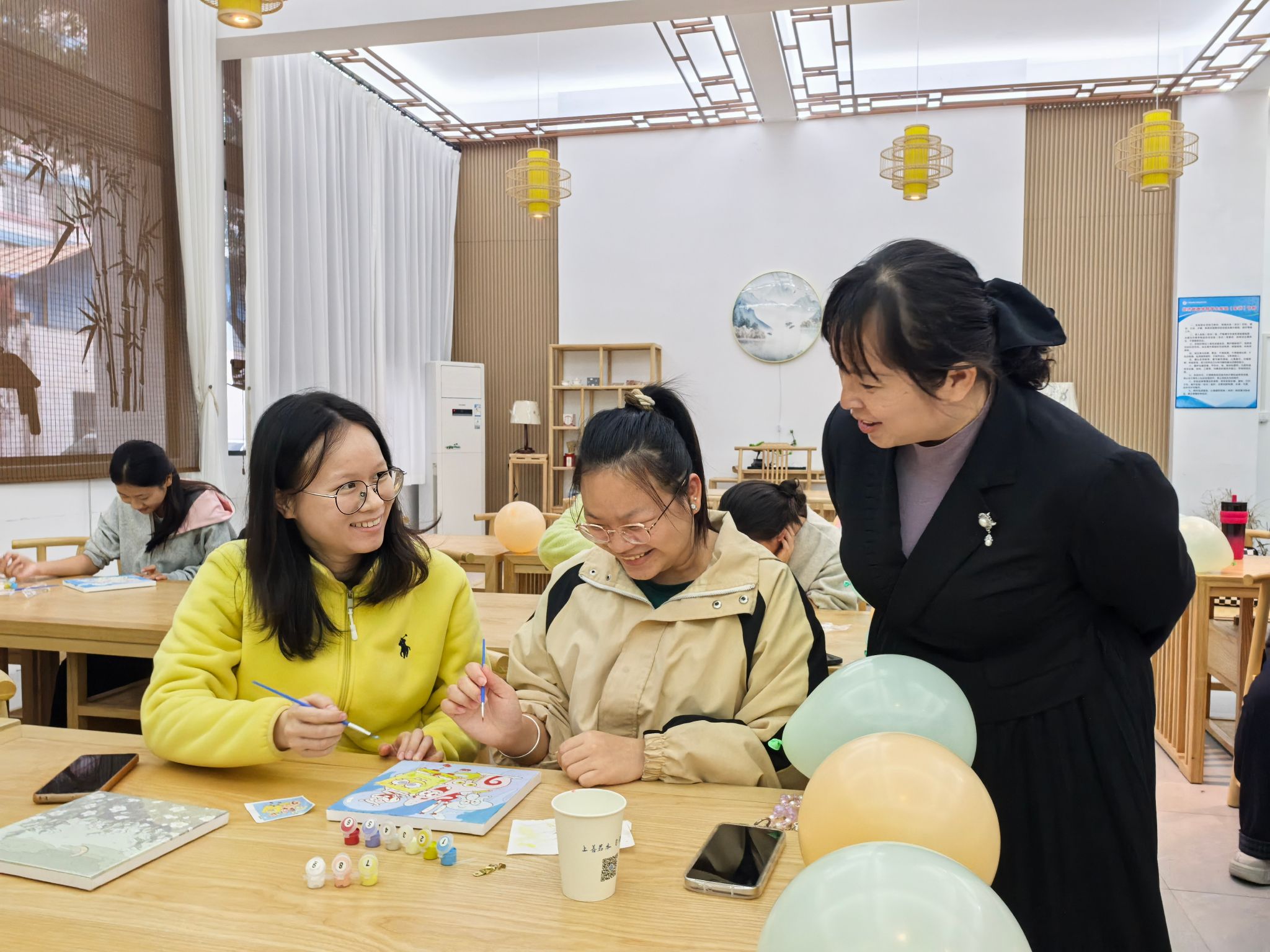 活动现场布置温馨,暖黄色灯笼与彩色气球点缀出轻松氛围,师生同坐一桌,共同参与绘画创作。活动以“师生共绘”为主题,学生与辅导员协作完成绘画,在提笔创作的互动中,打破了师生间的距离感,不少同学借着创作间隙分享日常学习生活的趣事与困惑,教师则以倾听者与引导者的身份给予建议,让心理疏导融入轻松的交流中。