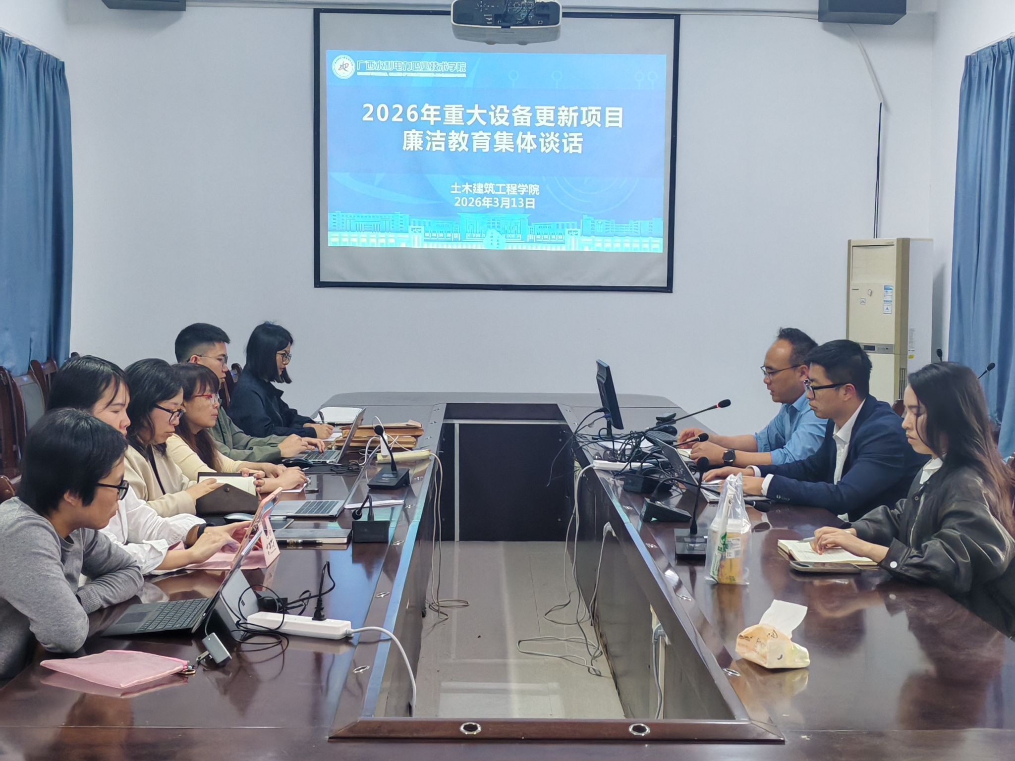 [本网讯]为深入推进党风廉政建设,筑牢重点岗位人员廉洁自律思想防线。3月13日,土木建筑工程学院党总支在长堽校区会议室组织召开廉洁教育集体谈话。学院教学团队负责人、专业负责人、实训中心全体教职工参加谈话。
