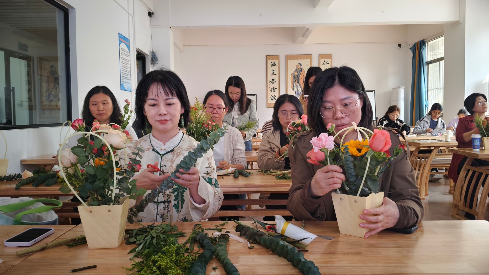 [本网讯]春风送暖,芳华绽放。为庆祝第116个“三八”国际劳动妇女节,进一步丰富女师生精神文化生活,展现新时代女性的风采与活力,3月6日下午,经济管理学院党总支、分工会、团委联合主办的“巾帼心向党·巧手绽芳华”三八国际劳动妇女节主题手工活动在经管实训楼3-5、3-6活动室成功举办。活动设置插花与彩绘团扇两个体验区,吸引了学院女教师和女同学积极参与,在花香与创意中共度温馨愉悦的春日时光。