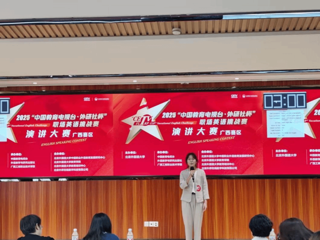 我校选手参加2025“中国教育电视台·外研社杯”职场英语挑战赛演讲大赛现场