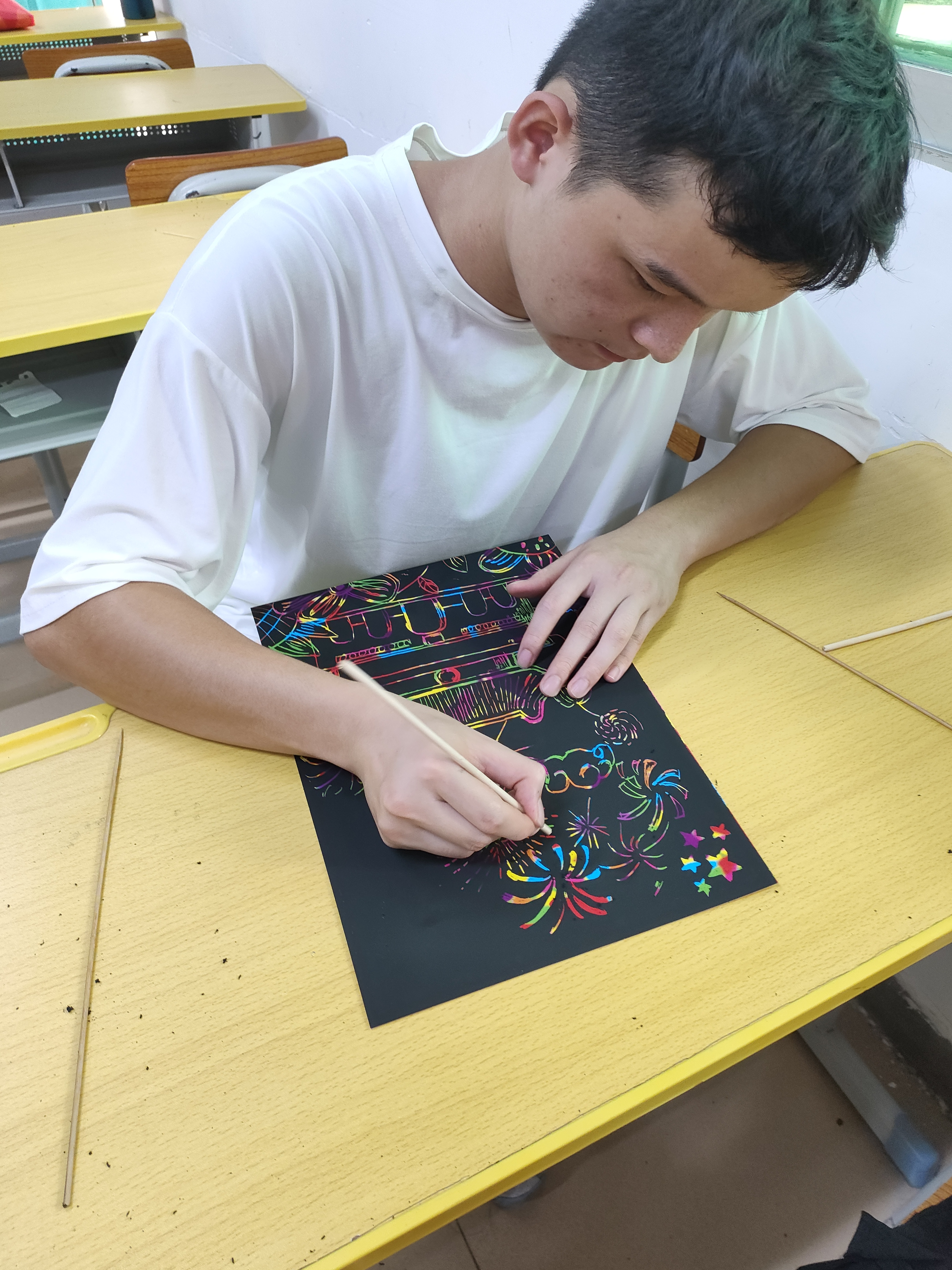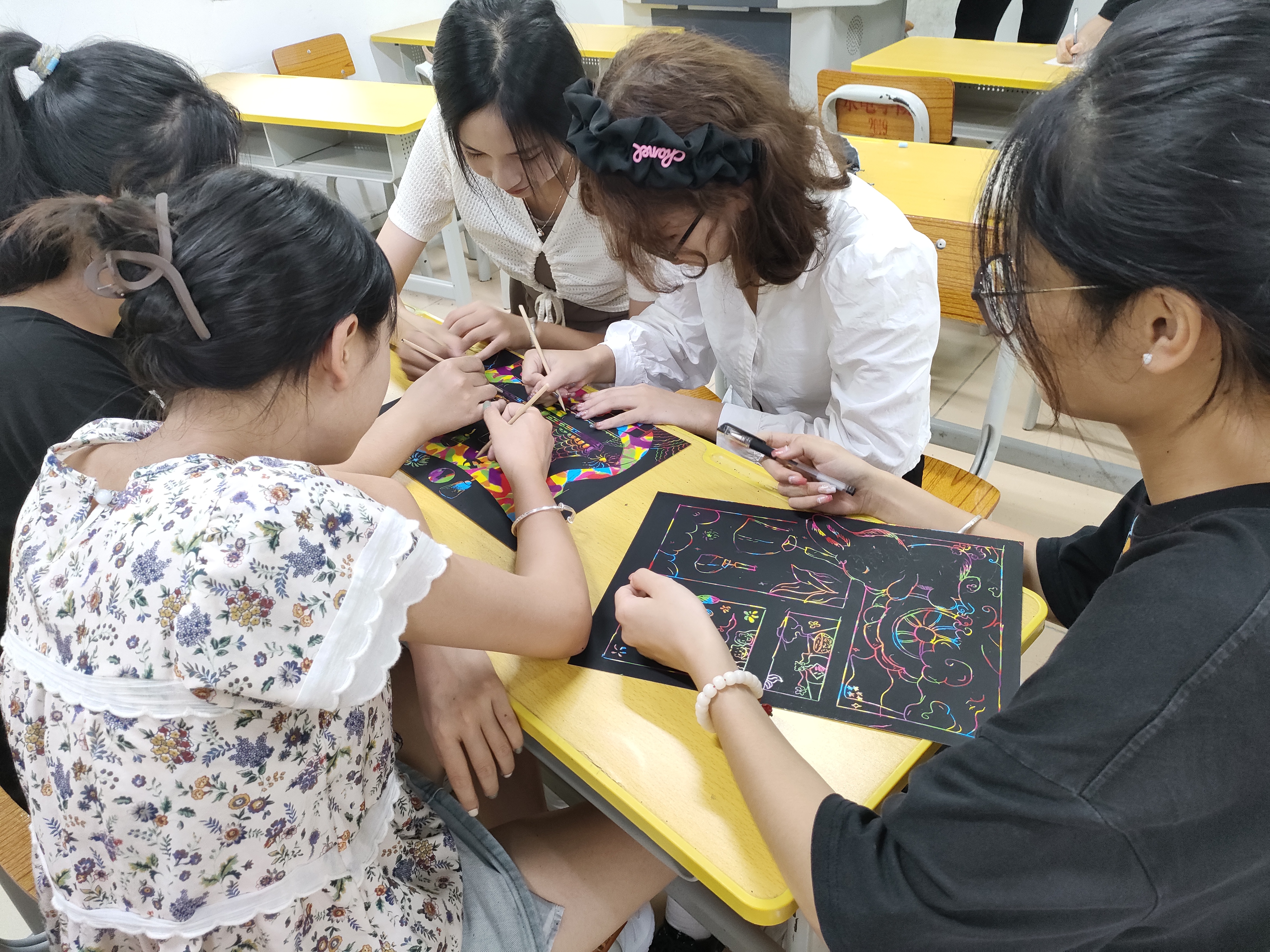 刮画,又名刮蜡、刮美卡,是一种新型的绘画减压方式。在快节奏的学习生活中很容易产生压力,长期压抑不利于学生们身心的健康。近年新的休闲方式“刮画”渐渐流行,成为艺术与游戏的结合,是大学生们休闲减压的好方法。学生们除了用竹笔在刮画纸上进行绘画创作以外,还可以配合其他工具进行作画,丰富画面效果。本次活动,学生以个人或团队的方式参与,以贴近迎中秋、庆国庆的主题来创作刮画作品。活动中,各团队学生有交流探讨、有沉着冥想,或静或动,彼此探讨创作、静静思考后再跃跃欲试。随着时间一点点的过去,刮画本身的七彩底色在学生们竹签笔下渐渐显现出来,一幅幅富有色彩灵动的图案跃然纸上,同学们创作了心中的节日祝福和美好的画面。(供稿/经济管理学院)