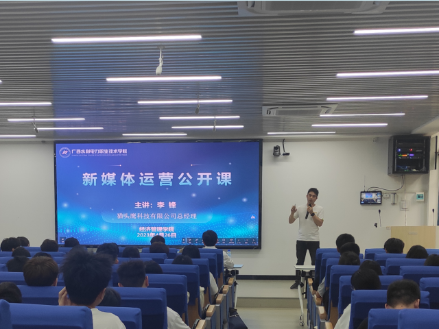 [本网讯]为提高教学质量,进一步推动产教融合,4月26日下午,经济管理学院在长堽校区四教1-5教室举办《新媒体运营》公开课,本次公开课邀请到了企业导师——猫头鹰科技有限公司总经理李锋担任主讲,经济管理学院工商管理、市场营销专业和信息工程学院电子商务专业等共160余名同学参加了本次公开课。经济管理学院部分老师也出席公开课,并与企业导师团队开展了深入交流。