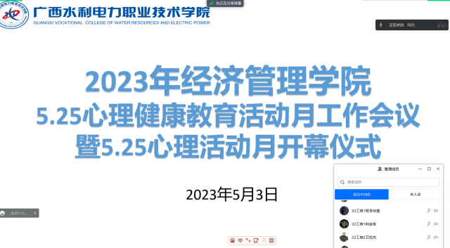 [本网讯]为深入贯彻落实党的二十大精神,培养德智体美劳全面发展的社会主义建设者和接班人,提升我院大学生心理健康素养,培育学生自尊自信、理性平和、积极向上的健康心态,营造有利于大学生身心健康发展的良好氛围,5月3日晚上,经济管理学院通过腾讯会议的方式召开了2023年“5.25”心理健康教育活动月心理骨干工作培训会议暨“5.25”心理健康教育活动月开幕仪式,会议由学院心理辅导站站长冯文老师主持,2021级、2022级班级心理委员、学院学生心理干部以及辅导员老师参加。