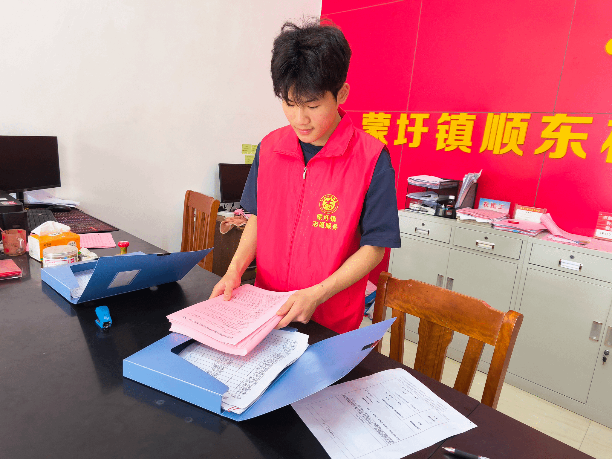 志愿者协助村委整理资料