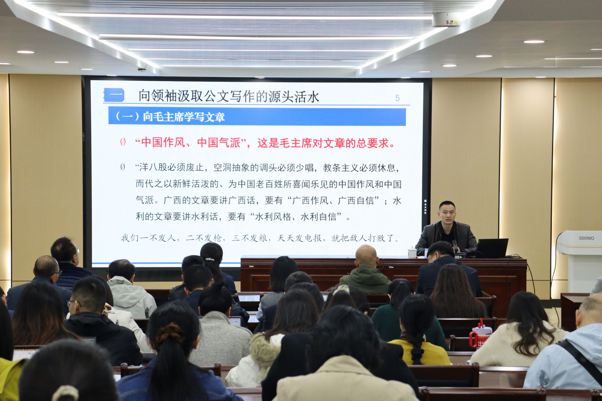 [本网讯]11月28日,学校在长堽校区举办了2025年“法治大讲堂”——法治思维下的公文写作之道专题培训。学校党委委员、宣传部部长唐亮主持培训并作总结讲话。本次培训邀请了自治区水利厅办公室副主任蒋兴旭同志进行专题授课。蒋兴旭以《公文写作当爱入细微久远》为题...