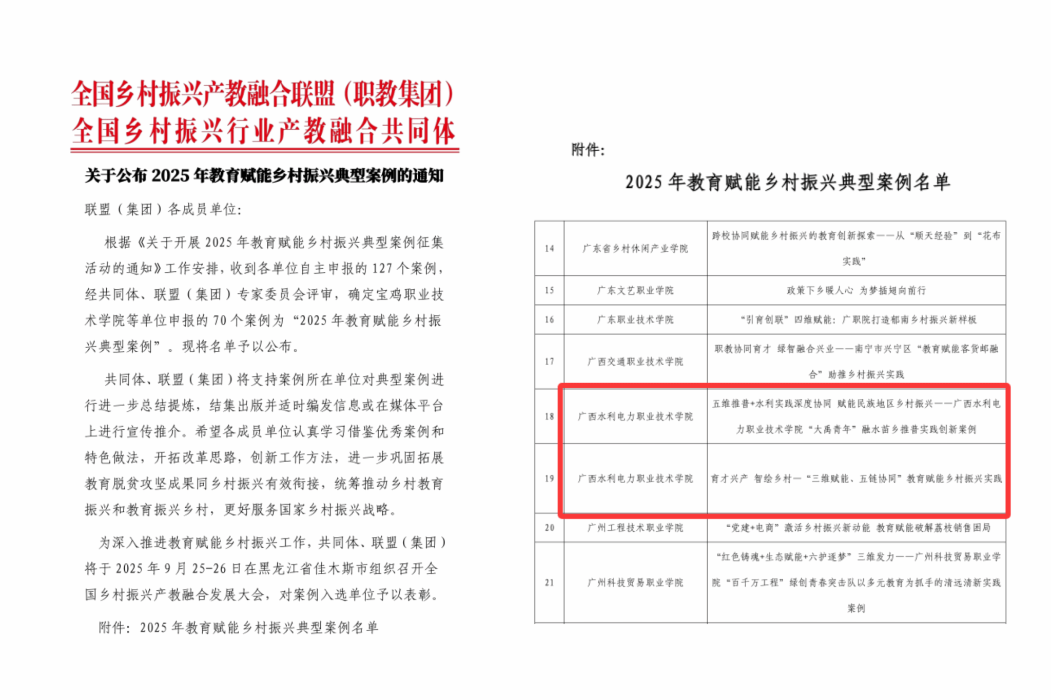 [本网讯]近日,全国乡村振兴产教融合联盟公布了2025年教育赋能乡村振兴典型案例遴选结果。我校报送的《五维推普+水利实践深度协同 赋能民族地区乡村振兴——广西水利电力职业技术学院“大禹青年”融水苗乡推普实践创新案例》和《育才兴产 智绘兴村——“三维赋能、五...