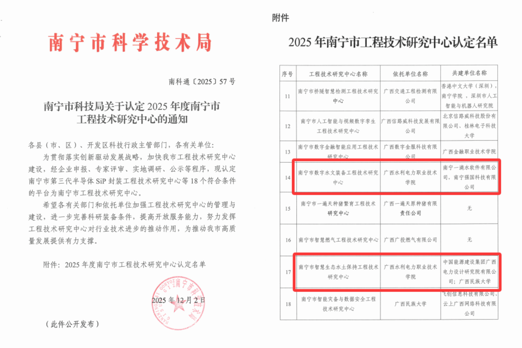 [本网讯]根据《南宁市科技局关于认定2025年度南宁市工程技术研究中心的通知》(南科通〔2025〕57号),我校“南宁市数字水文装备工程技术研究中心”“南宁市智慧生态水土保持工程技术研究中心”喜获认定。学校分别与南宁一滴水软件有限公司、中国能源建设集团广西电...