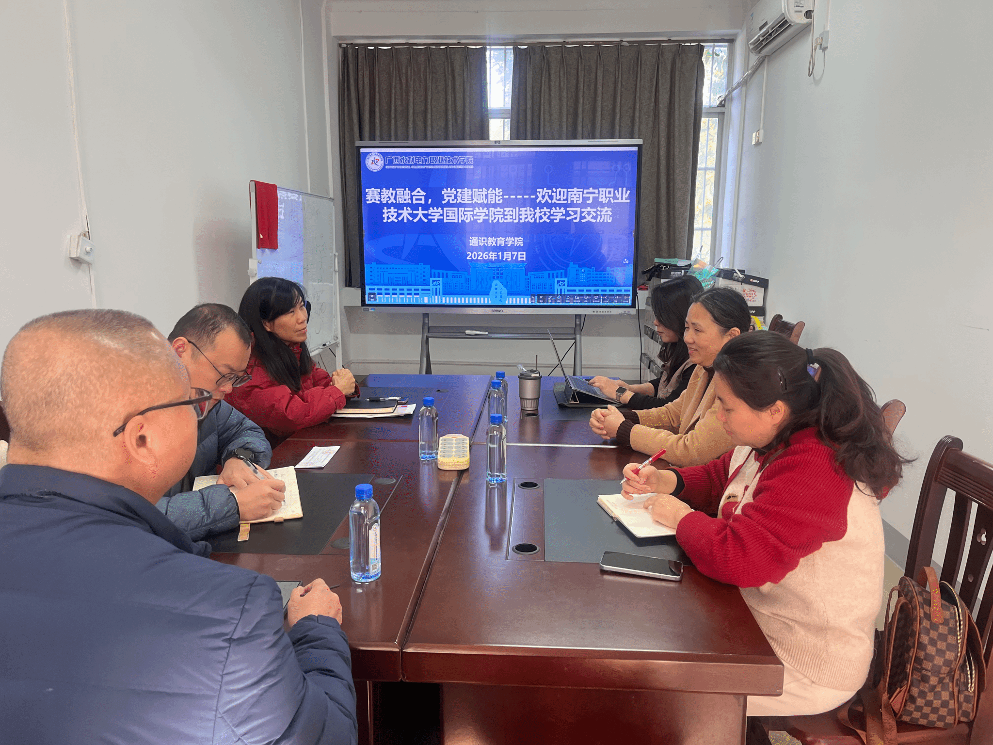 [本网讯]1月7日上午,南宁职业技术大学国际学院党员教师代表一行5人莅临我校通识教育学院,开展“赛教融合 党建赋能”专题交流活动,双方围绕技能竞赛与党建共建深度融合展开深入研讨。通识教育学院党支部书记韦嵚,副院长邓登云参加会议。作为2026年广西职业院校技...