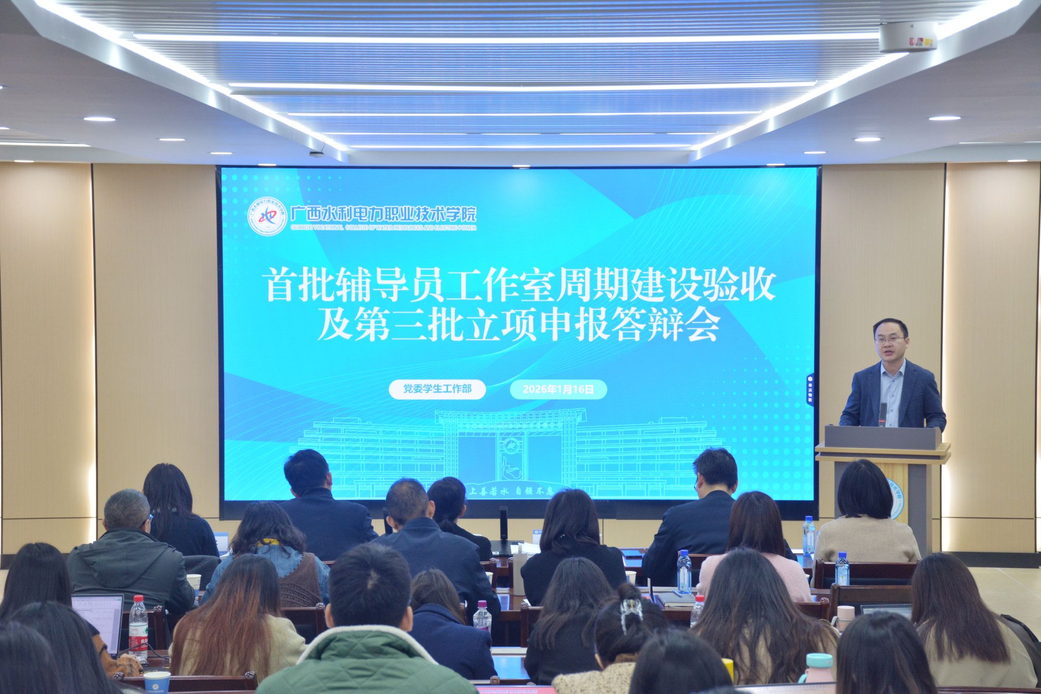 [本网讯]1月16日,学校在长堽校区四教2-5举办首批辅导员工作室周期建设验收考核及第三批立项申报答辩会。学校副校长黄海滨出席会议。黄海滨结合学校辅导员队伍建设实际与学生思想政治教育工作现状,就进一步深化辅导员工作室建设、充分发挥工作室育人阵地作用,提出...