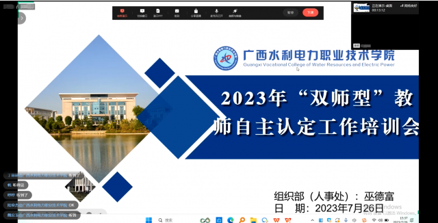 [本网讯]2023年是学校开展广西职业教育“双师型”教师自主认定工作的第一年,为做好宣传动员和组织认定工作,7月26日,学校召开2023年“双师型”教师自主认定工作培训会。培训会在企业微信上以线上直播的方式进行,学...