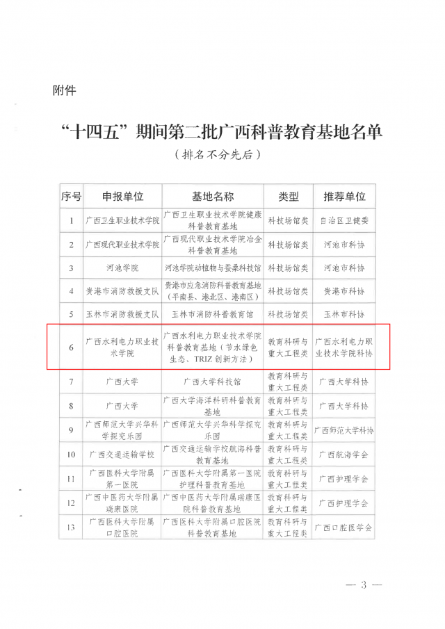 [本网讯]日前,根据《自治区科协关于认定“十四五”期间第二批广西科普教育基地的通知》(桂科协普发〔2023〕39号),我校节水绿色生态、TRIZ创新方法科普教育基地成功获批广西科普教育基地。为贯彻落实《关于新时代...