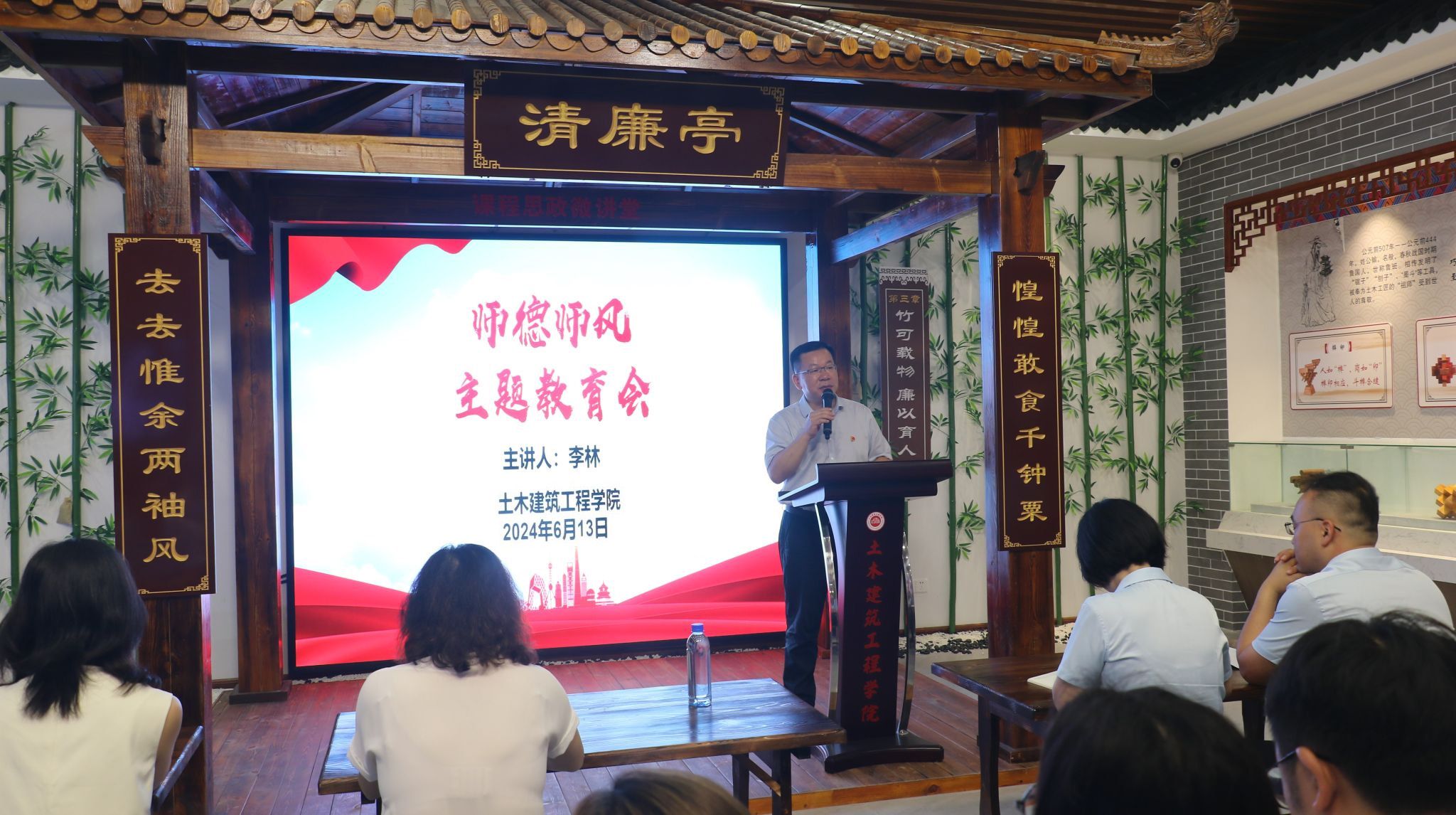 [本网讯]6月13日,土木建筑工程学院党总支在里建校区廉政教育基地开展“坚守教育强国初心,践行为国育才使命”主题微党课暨师德师风主题教育会。党课由校长李林同志主讲,学校总会计师潘念萍、继续教育学院副院长梁依宁受邀列席,学院全体教师党员参加。李林同志为在...
