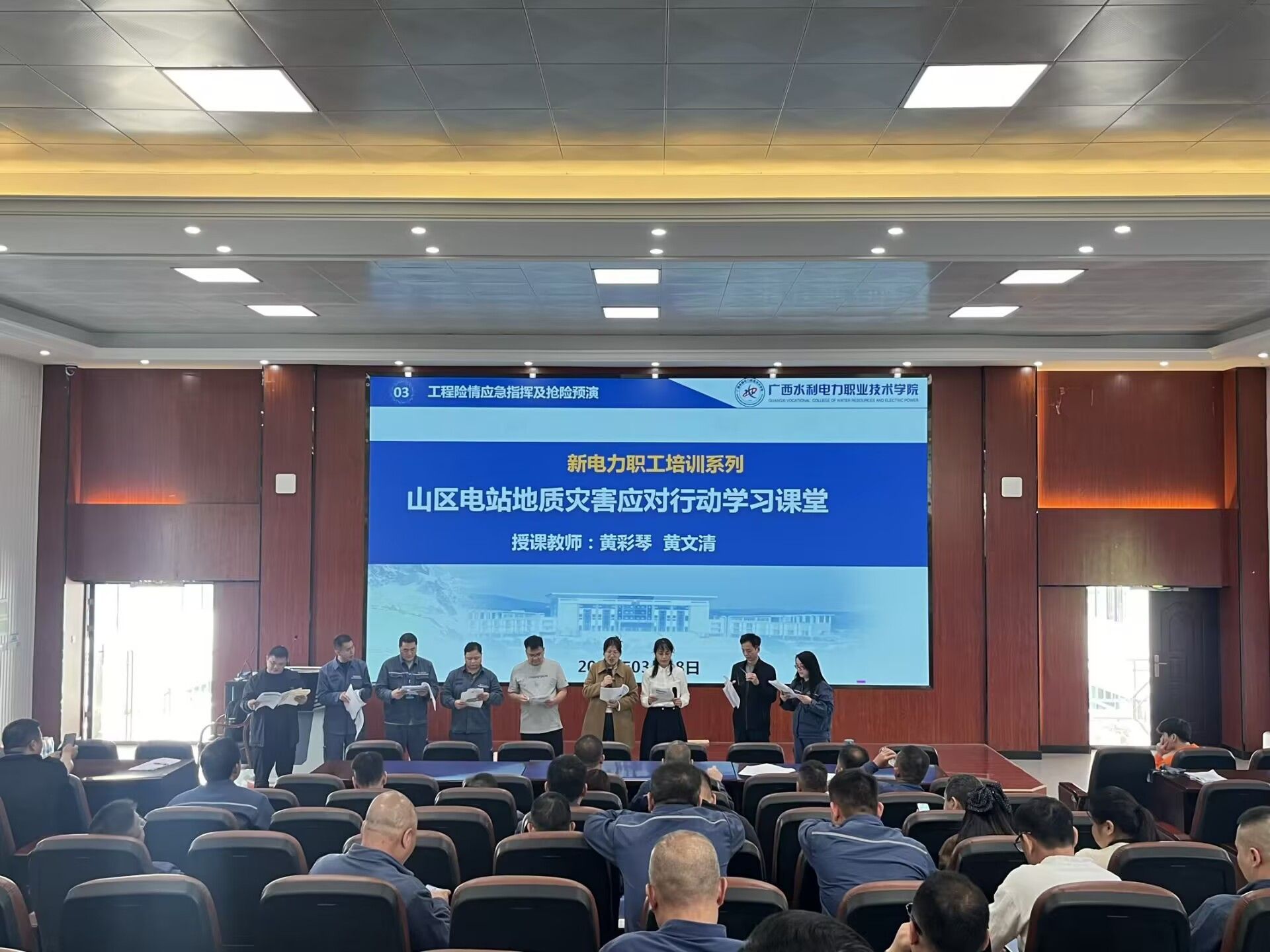 [本网讯]3月18日,水利工程学院教工第二党支部教师党员黄文清、黄彩琴,带领广西职业技能竞赛安全生产应急救援赛项获奖学生团队,走进广西新电力投资集团小水电运行及检修人员专题培训班,开展生产安全事故应急处置演练实践教学。