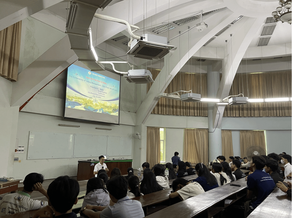 [本网讯]教育部新时代职业学校“三名计划”吴美琼名师工作室成员韦庆华近日受邀到柬埔寨理工学院(ITC),参与该校水文与水资源系专业方向选择说明会,并在会上进行施工现场安全技术分享,柬方教师、校友及80名学生参与活动。