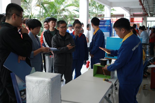 本次决赛邀请了广西—东盟经开区人才交流服务中心主任覃竹鸾、广西电网公司武鸣供电局东盟供电所经理梁瑶、广西冰客食品有限责任公司总经理韦志福、广西珠江啤酒有限公司总经理助理樊明昊、广西南宁市瑞丹食品有限公司总经理陈来明、广西经济职业学院学工处处长陆金丽等6名校外专家担任大赛评委。大赛决赛分为创新产品类(A 类)、创意设计类(B类)两个组别进行。评委对参赛作品的功能完整性、创新性、结构工艺性、新技术应用、实用性、现场答辩表现等方面进行综合评分。