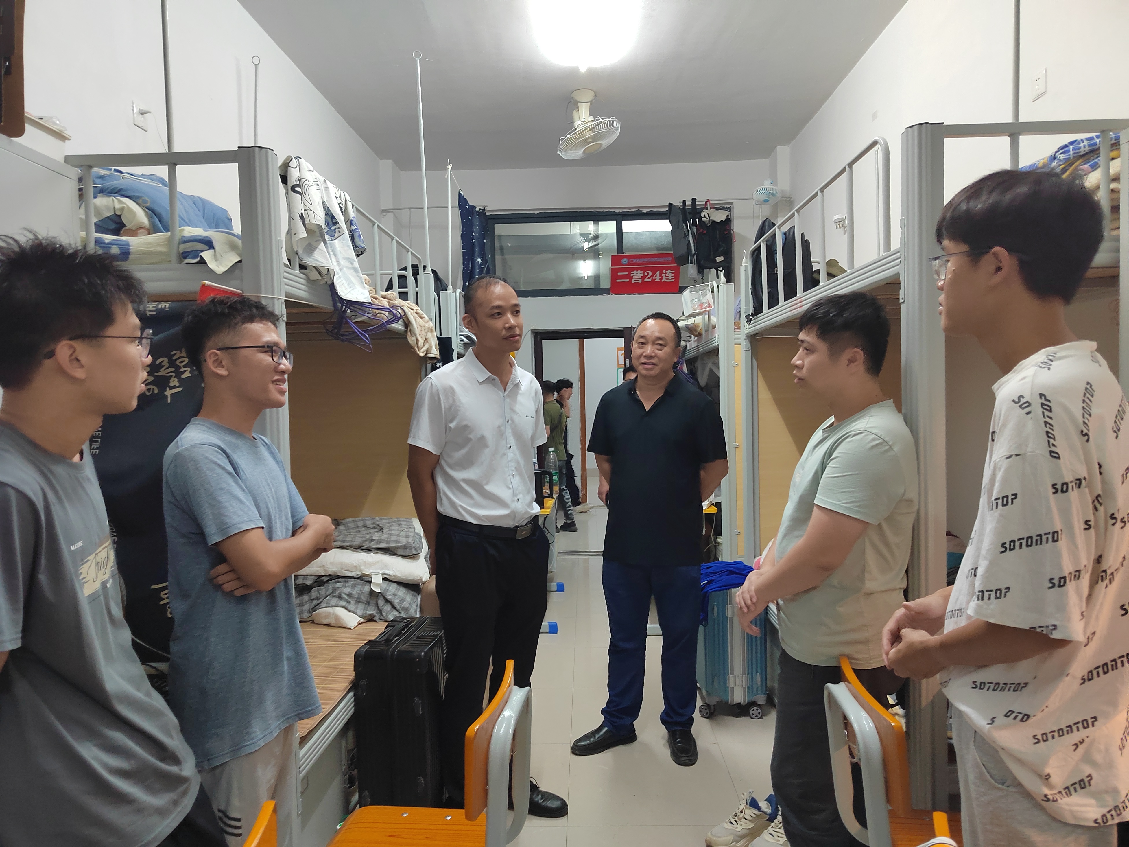 [本网讯]迎接新学期,展示新面貌,为了解学生的思想动态和新学期的适应情况,帮助学生及时调整状态,全身心投入到大学的学习活动中。2023年9月4日晚,电力工程学院党总支书记罗宇强、学院副院长谭振宇带领全体2022级辅导员深入学生宿舍,实地了解学生开学相关情况,并为学生送去关心和问候。
