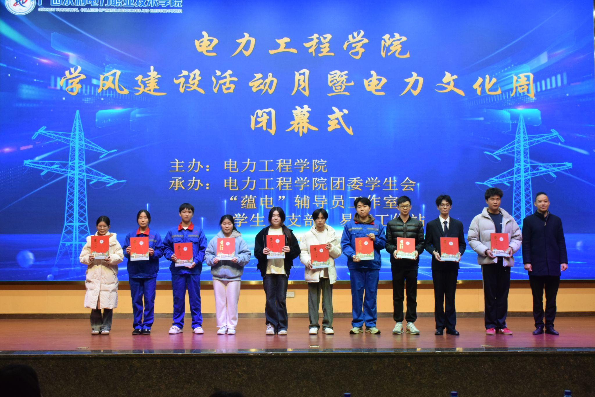 闭幕式上,罗宇强对学风建设月、电力文化周系列活动成果给予了肯定,并宣读表彰文件。随后来自25发电厂6班李益宏、24新能源1班谢黄权鸿、24供轨1班覃芳梅、25继保班江彩凌等同学分别就团支部建设、优秀学生成长事迹、电力科普宣讲、电力岗位认知报告等内容进行了主题分享。颁奖仪式上,学院对优秀团日活动、书香班级、优秀学生报告团、学习进步学子、技能竞赛等方面表现突出的集体和个人进行颁奖,充分肯定了同学们在思想引领、学风建设、技能发展等方面的卓越表现。