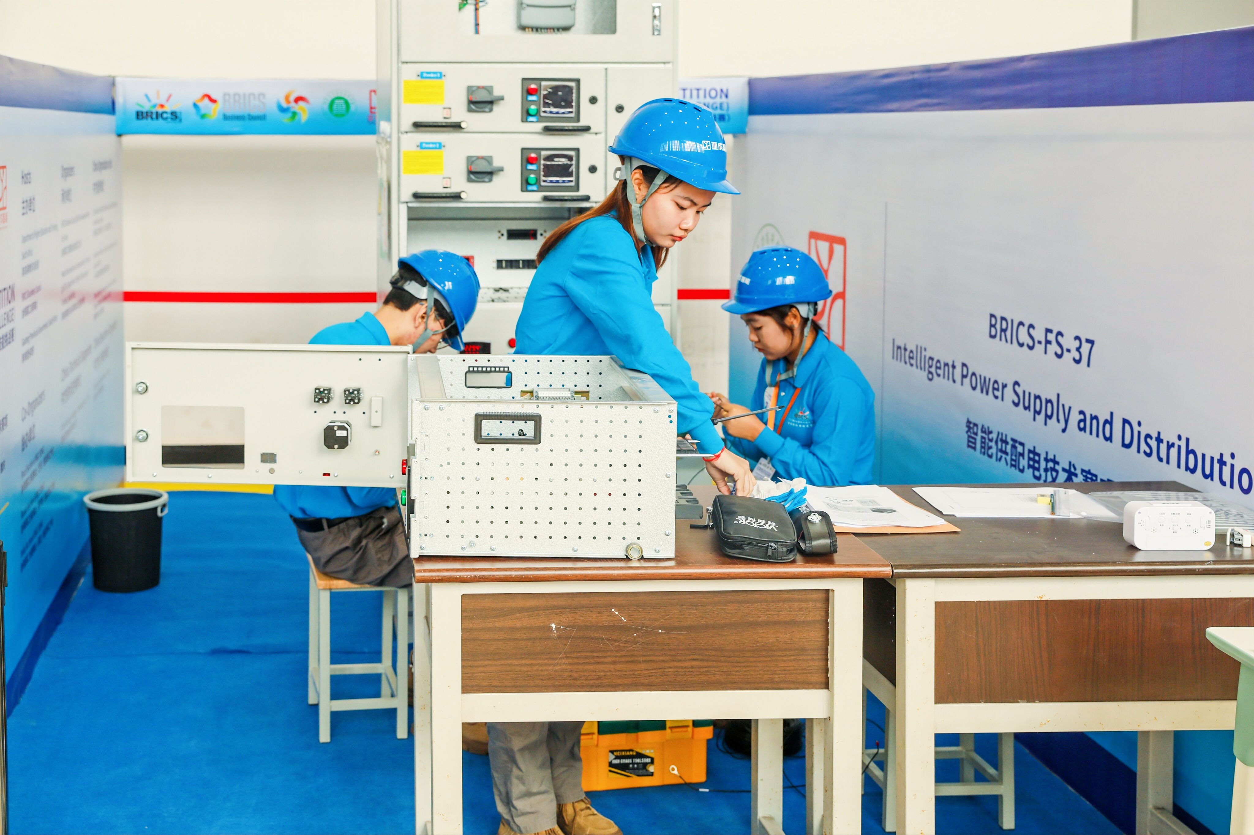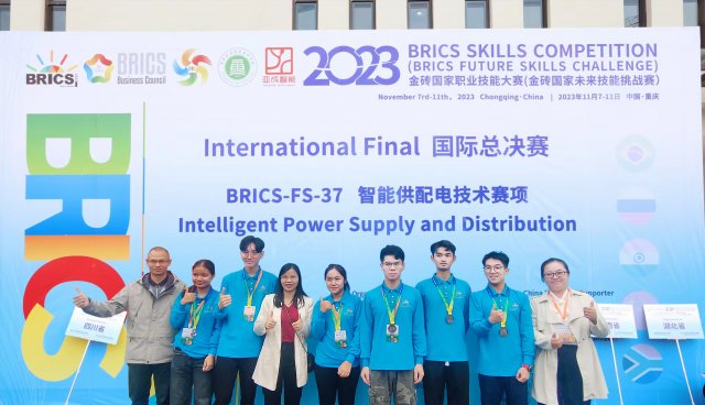 [本网讯]2023金砖国家职业技能大赛“智能供配电技术”赛项国际总决赛于11月7-11月11日在重庆电力高等专科学校潼南校区顺利举行。来自全国45所高职院校的45支国内队伍,以及来自柬埔寨、老挝、泰国等国外队伍同台竞技,历练技能、展示风采。电力工程学院发电厂及电力系统专业21级发电厂2班陈巨隆、韦志瑜、21级供用电技术2班谢增涛三位同学组成的国内参赛队荣获大赛国内赛团体二等奖!我校柬埔寨留学生Ly Henglay、Nop Rothmarady、Mom Sokdalin三位同学组成的国外参赛队荣获大赛铜奖的好成绩;覃贵芳、林瑜获“优秀指导老师”称号!