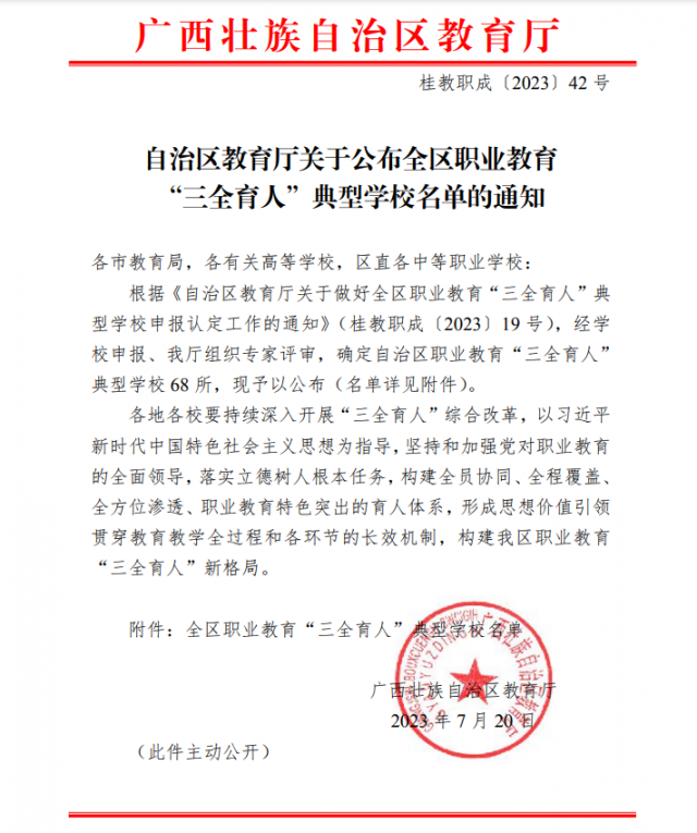 [本网讯]7月20日,自治区教育厅印发《关于公布全区职业教育“三全育人”典型学校名单的通知》(桂教职成〔2023〕42号),公布了全区职业教育“三全育人”典型学校的名单,我校入选全区职业教育“三全育人”典型学校,这是我校落实立德树人根本任务,推进“三全育人”综合改革取得的又一项标志性成果。