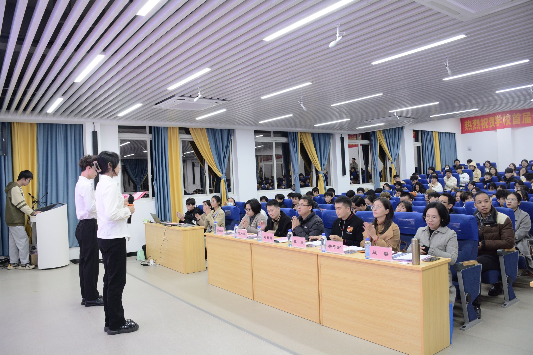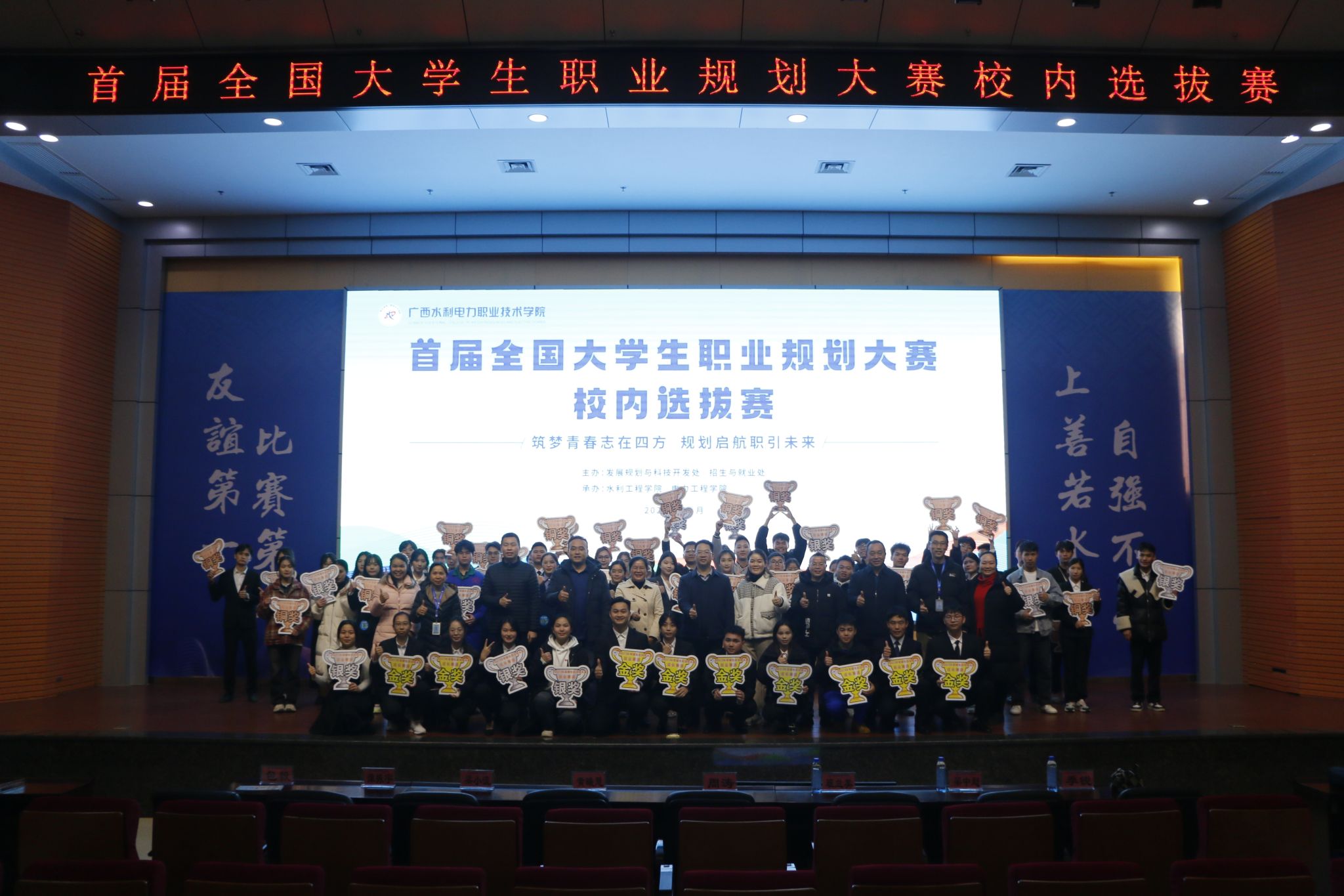 校内选拔赛分为成长赛道和就业赛道,设置主题陈述、评委提问、天降offer环节。邀请来自区内“双高”院校的专家5人,广西区人才库专家2人,优质企业招聘主管9人。校选手们在舞台上展现了水电学子勇于担当、拼搏奋进的青春风貌,赛出了自己最好水平。通过评委们公开、公平、公正的评审,成长赛道评出5个金奖、10个银奖、25个铜奖,就业赛道评出5个金奖、11个银奖、23个铜奖。