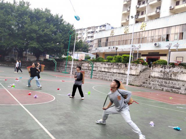 而另一边的背篓抛绣球比赛现场,同学们默契合作,抛绣球的同学瞄准目标,轻甩绣球,使绣球在空中划出一道道美丽的弧线;背篓接球手们更是集中注意力,以半蹲或半跪的姿态配合着绣球抛出的方向斜侧身体,迅速地用背篓接住五彩缤纷的绣球。