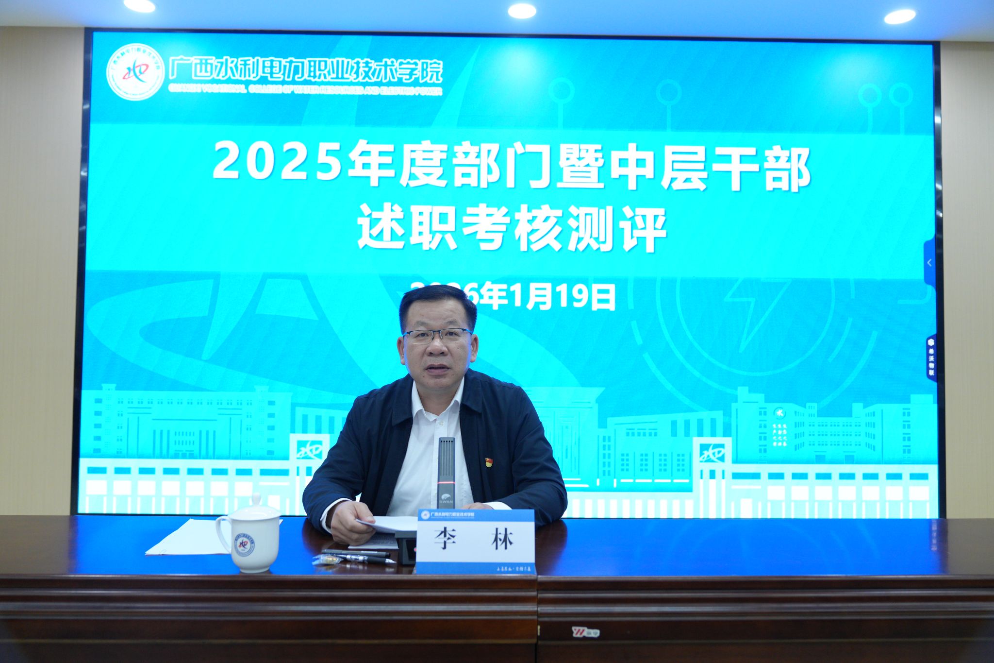 会议分两个阶段进行:第一阶段是基层党组织书记抓党建工作述职考核。各党总支(直属党支部)书记围绕履行“第一责任人”职责情况、年度党建工作成效、突出问题及改进思路进行现场述职,李林对述职情况进行了集中点评。第二阶段是部门暨中层干部述职考核测评。各部门主要负责人紧扣学校“十四五”规划收官与“双高”建设核心任务,对照年度KPI指标,以详实数据和具体案例,汇报了2025年工作亮点、存在问题及2026年计划。全体中层干部提交了书面述职述廉报告。与会人员对各基层党组织、各部门进行考核测评及全体中层干部进行了民主测评。