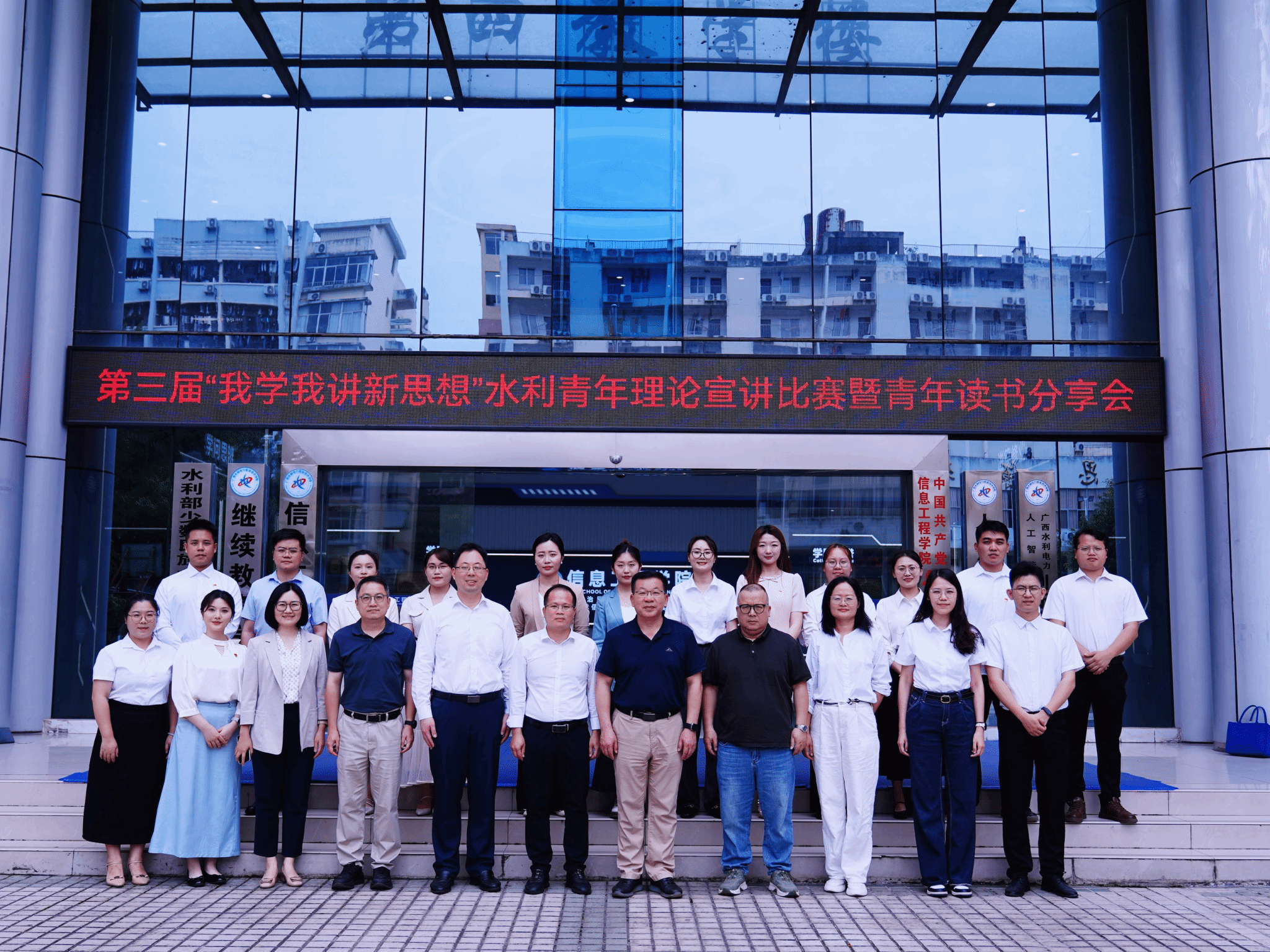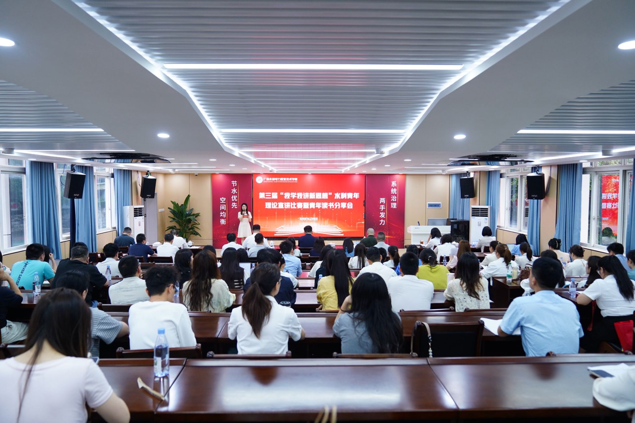 [本网讯]4月23日下午,学校第三届“我学我讲新思想”水利青年理论宣讲比赛暨青年读书分享会在长堽校区成功举办。学校党委书记李林出席活动并致辞,活动特邀广西民族大学博士生导师、团委书记梁罡,广西大学博士生导师、马克思主义学院教研部主任杨勇,自治区水利厅机关党委一级主任科员廖伟等担任评委。来自各二级学院的15支青年教师队伍同台宣讲,以青春之声传播党的创新理论。