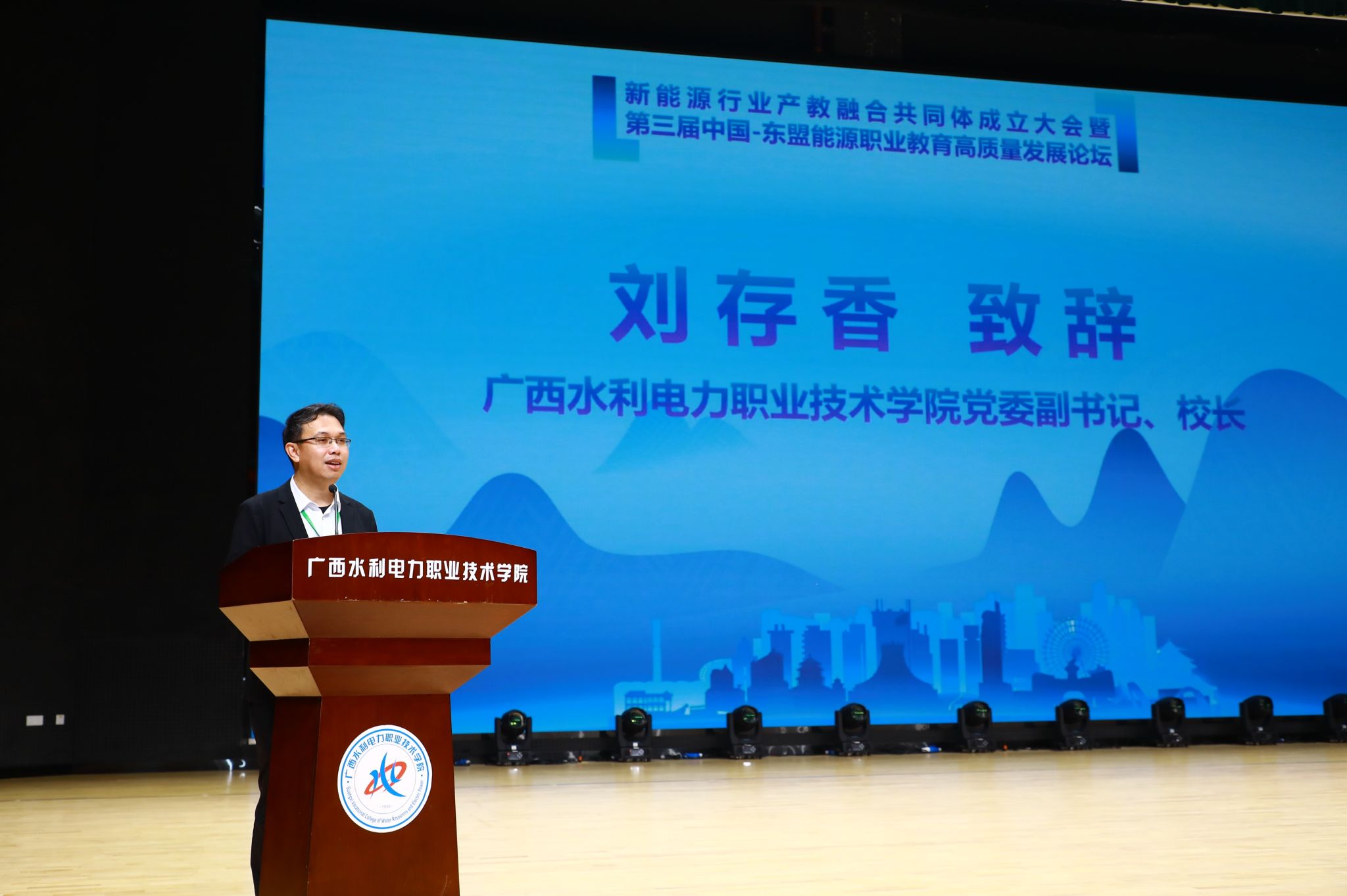 [本网讯]11月22日,新能源行业产教融合共同体成立大会暨第三届中国-东盟能源职业教育高质量发展论坛在学校里建校区大学生活动中心顺利召开。我校校长刘存香,金砖国家技能发展与技术创新大赛组委会执委会国内竞赛办公室副处长林秋明、广西安全工程职业技术学院副校长许钟尤、广西大学电气工程学院党委书记梁志坚、上海电力大学能源与机械学院副院长陈乃超出席大会现场。大会由我校主办,广西电力行业协会、中关村智能电力产业技术联盟、广西水利与能源动力职业教育教学指导委员会协办,我校副校长周涛主持。