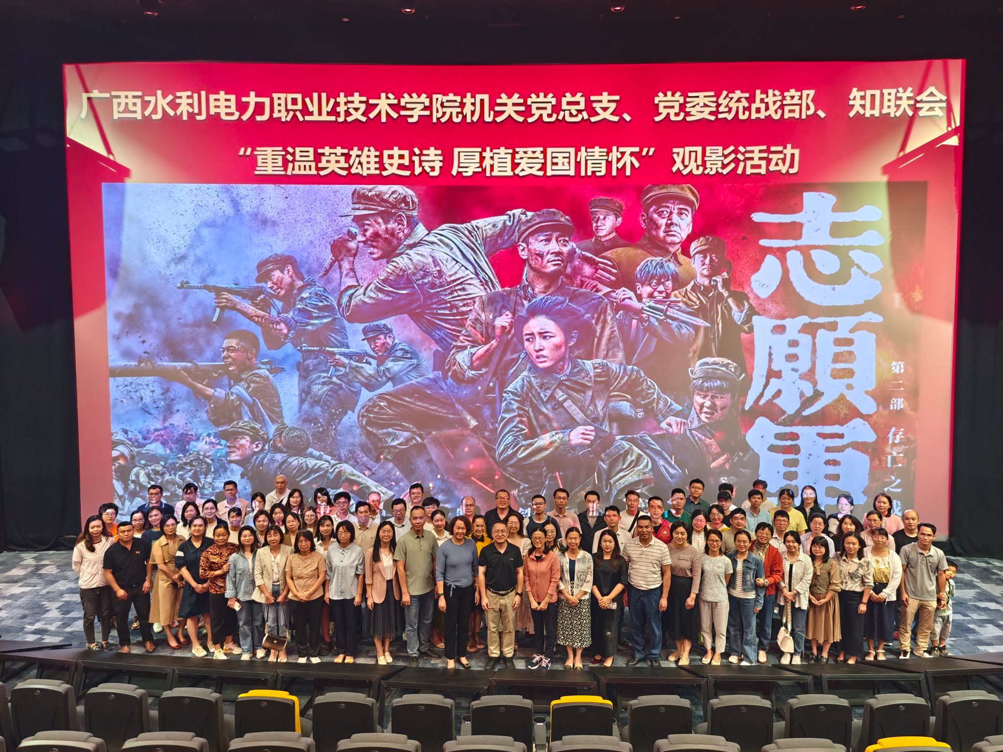 [本网讯]2024年10月25日是中国人民志愿军抗美援朝出国作战74周年纪念日。为铭记历史、致敬老兵,学校机关党总支、党委统战部、知联会联合开展“重温英雄史诗 厚植爱国情怀”红色观影主题党日活动,集体赴南宁实验电影院观看红色电影《志愿军:存亡之战》。