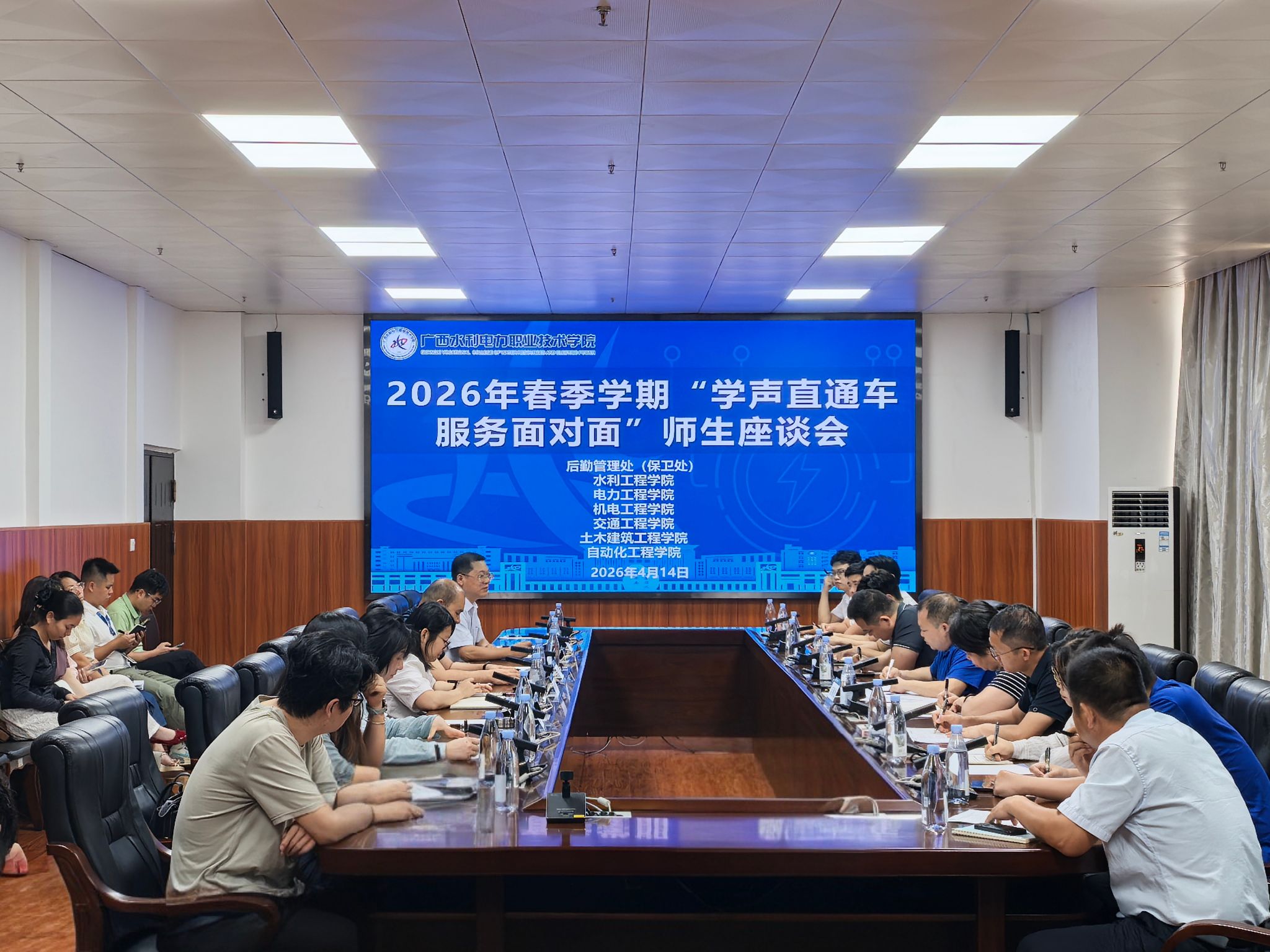 座谈会上,各二级学院师生代表结合前期收集的师生意见,围绕校园安全管理、宿舍设施维修、食堂餐饮品质、校园环境优化及水电服务保障等学习生活热点问题踊跃发言,提出了若干具体意见和建议。相关科室及两校区物业、食堂、节能服务等第三方单位负责人认真倾听、逐一记录,并对同学们提出的问题进行了细致回应与解答。